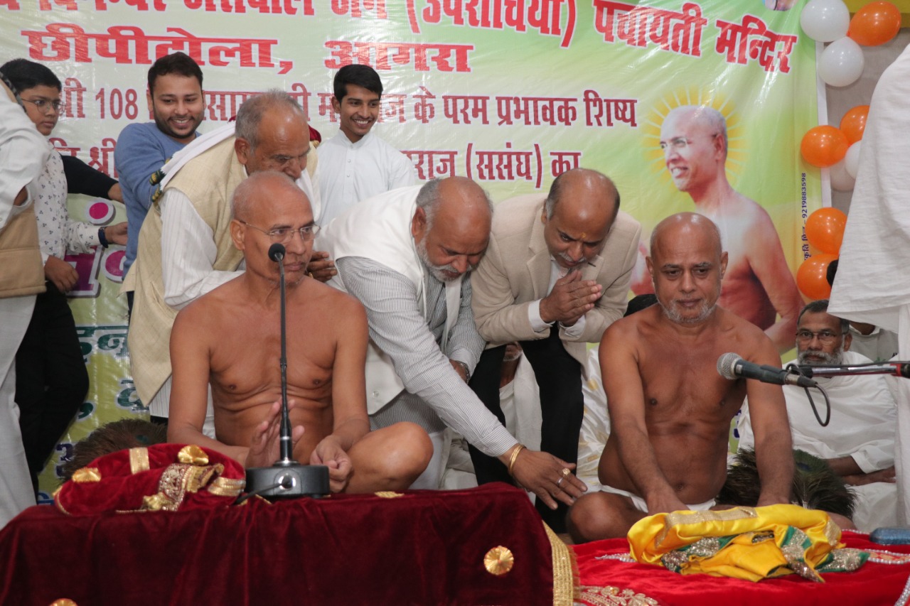 आज रविवार को संत शिरोमणि आचार्य विद्यासागर जी महाराज के परम प्रभावक मुनि श्री अजित सागर जी महाराज ससंघ का प्रथम बार आगरा के छीपीटोला स्थित श्री पार्श्वनाथ दिगंबर जैन मंदिर की पावनधरा पर प्रथम बार भव्य मंगल प्रवेश हुआ| मुनिसंघ पथौली से मंगल विहार करते हुए छीपीटोला चौराहे पर पहुंचे जहां पर सैकड़ों श्रद्धालुओं द्वारा भव्य शोभायात्रा के साथ जैन भवन छीपीटोला पहुंचे जहां मुनि संघ की भव्य अगवानी की| मुनिसंघ मंदिर पहुंचने पर सर्वप्रथम देव दर्शन किए|