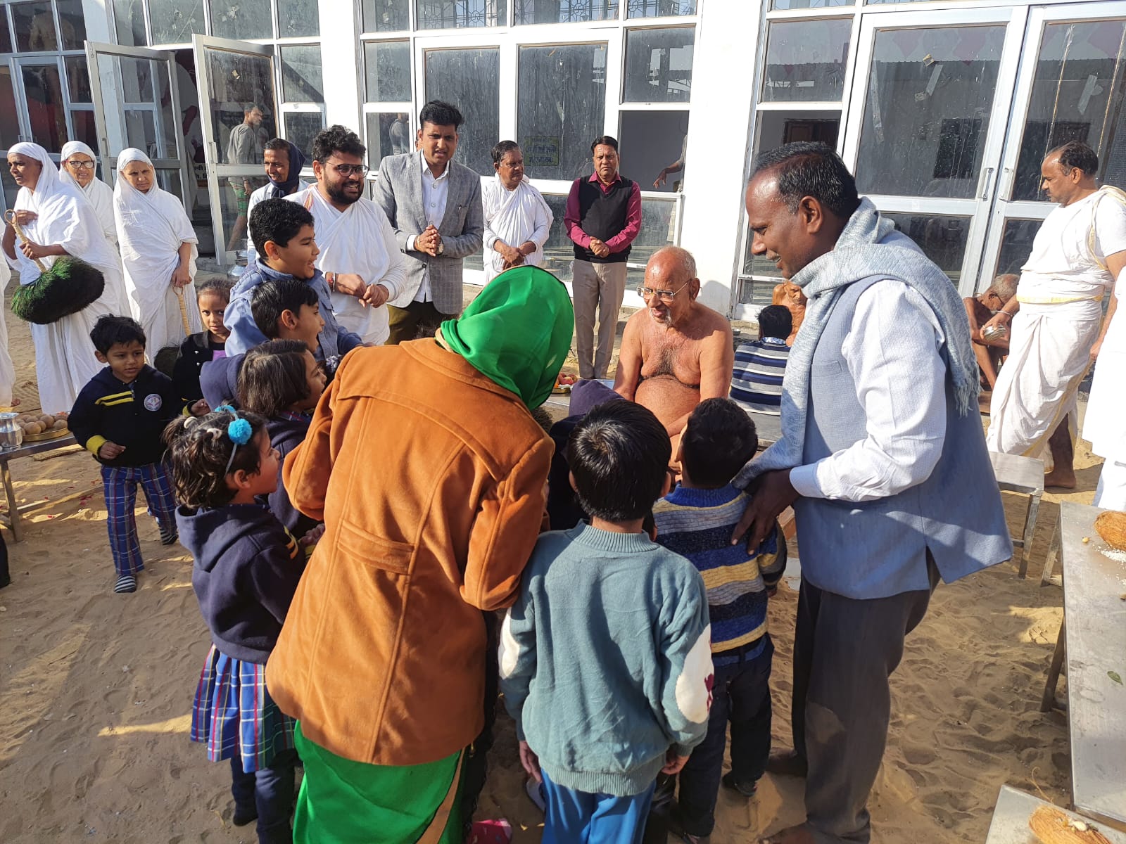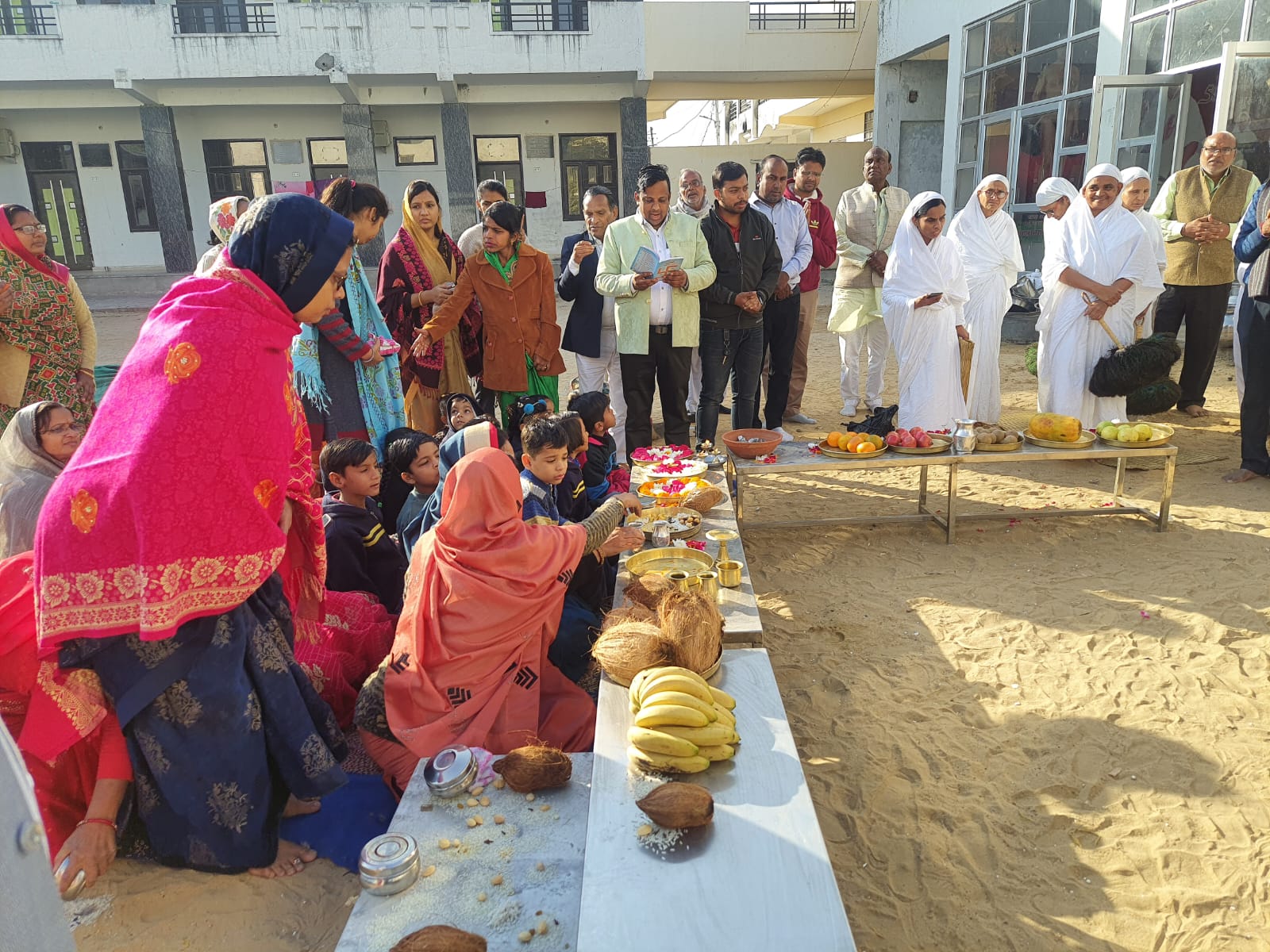 नीरा जैन आरामशीन वाले एवं सुनील सर्राफ के मार्ग निर्देशन मे सैकडों बच्चों को पूजन प्रशिक्षण दिया गया जिसमें सोमवार को सुबह सभी बालक बालिकाओं ने आचार्य वर्धमान सागर महाराज की भक्ति भाव एवं अष्ट द्रव्य से पूजा अर्चना की गई। जौंला ने बताया कि समाज के बच्चों को श्री शांतिसागर स्कूल के सभी स्टाफ एवं आयोजक ने अच्छी शिक्षा के साथ साथ धार्मिक संस्कार भी दिये गए। इस दौरान आचार्य सन्त एवं आर्यिका विज्ञाश्री माताजी ने स्कूल का भ्रमण कर अवलोकन किया जहाँ सभी बच्चों ने आचार्य श्री को वन्दन नमोस्तु करके अगुवाई की। इस अवसर पर आचार्य संध एवं विज्ञाश्री माताजी ने बच्चों को भरपूर आशीर्वाद दिया एवं बच्चों को आचार्य संध के आशीर्वाद से समाज के कर कमलो द्वारा बच्चों को गिफ्ट स्वरूप पुरस्कार दिया गया। जौंला ने बताया कि कार्यक्रम के पश्चात इतिहास में पहली बार 39 चर्तुविंध संतो के अन्तर्गत संध का पड़गाहन कार्यक्रम हुआ जिसमें मंगल प्रवेश के पश्चात राष्ट्रीय संत गौरव आचार्य वर्धमान सागर महाराज को समाजसेवी गोपाल लाल शंभु कुमार जैन कठमाणा एवं रामपाल ओमप्रकाश जैन चंवरिया ने पड़गाहन करवाया एवं उनको आहार चर्या करवाने का सौभाग्य मिला।