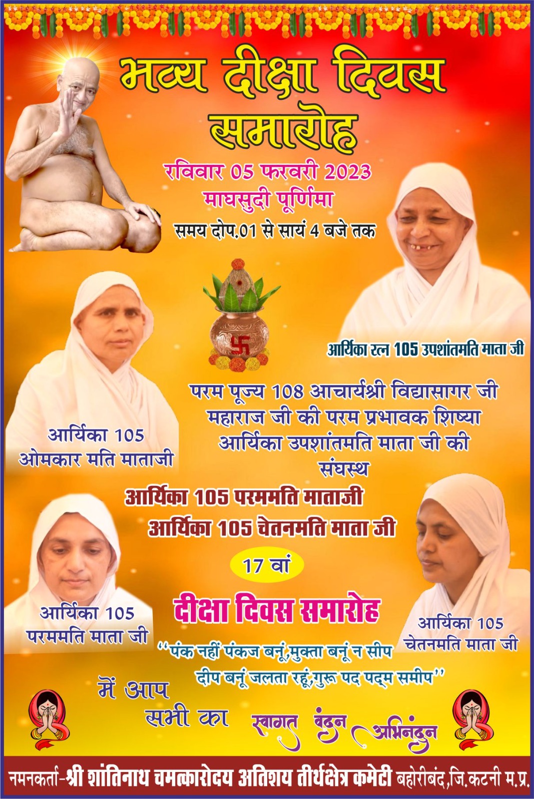 श्री दिगंबर जैन चमत्कारोदय अतिशय का तीर्थ क्षेत्र कमेटी बहोरीबंद में परम पूज्य गुरुवर आचार्य भगवन 108 विद्यासागर महाराज के मंगल आशीर्वाद से क्षेत्र पर विराजमान परम पूज्य आर्यिका 105 उपशान्तमति माताजी संघ सहित विराजमान हैं। इसी क्रम में पूज्य माताजी संघस्था परम पूज्य आर्यिका105 परममति माताजी एवं आर्यिका 105 चेतनमति माताजी का 17 वा दीक्षा दिवस 5 फरवरी 2023 रविवार को दोपहर की बेला में होगा। जो भव्य होगा।