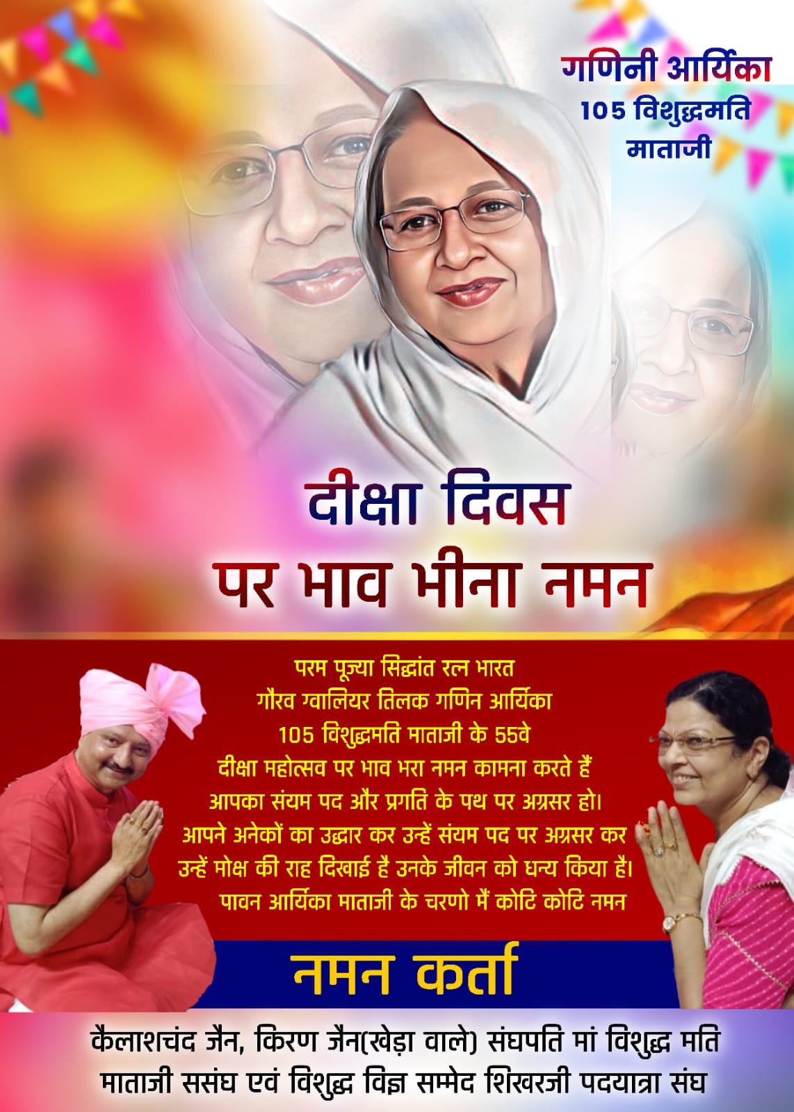 परम पूज्या ग्वालियर तिलक भारत गौरव त्रिलोक कल्याणी गणिनी गुरु मां विशुद्ध मति माताजी का 55 वा दीक्षा दिवस उन्हीं की परम आर्यिका 105 विप्रभमति माताजी के सानिध्य में मालवा माटी की पावन वसुंधरा बड़नगर की धरा पर भक्ति भाव से मनाया गया।