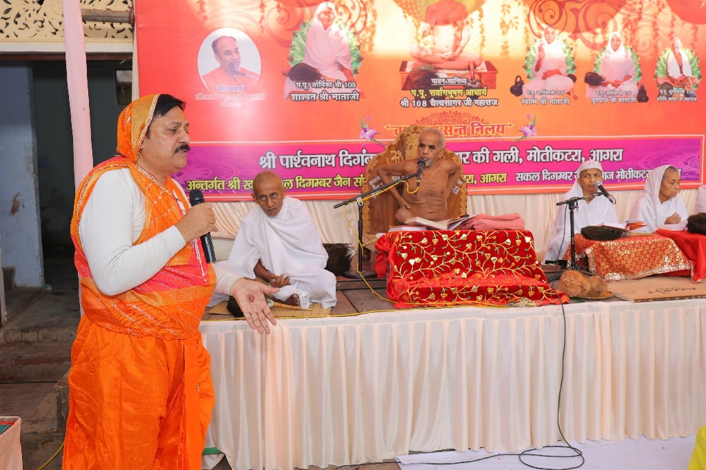 मंगलवार को आचार्यश्री चैत्यसागर जी महाराज ससंघ के मंगल सानिध्य में अष्टान्हिका महापर्व के पावन अवसर पर आगरा के मोती कटरा स्थित तार की गली के श्री पार्श्वनाथ दिगंबर जैन मंदिर वात्सल्य संत निलय में दस दिवसीय श्री सिद्धचक्र महामंडल विधान का आयोजन चल रहा है। जिसमे विधान के दूसरे दिन 28 फरवरी को भक्तों ने श्रीजी का अभिषेक एवं शांतिधारा की इसके बाद विधानाचार्य आनन्द जैन शास्त्री के कुशल निर्देशन में भक्तों ने मंत्रोच्चारण के साथ श्रीजी के चरणों में 16 अर्घ्य समर्पित कर विधान की मांगलिक क्रियाएं सम्पन्न की। इस विधान में भक्त प्रभु भक्ति करते हुए भरपूर धर्मलाम उठा रहे हैं। विधान के मध्य में आचार्य श्री चैत्यसागर जी महाराज के मंगल प्रवचन भी हुए|