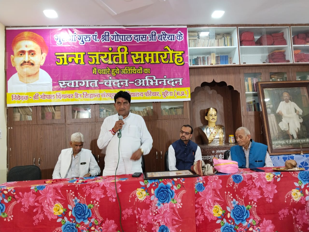जानकारी देते हुए मनोज जैन नायक ने बताया की श्री गोपाल दिगम्बर जैन संस्क्रत महाविद्यालय के उपमंत्री श्री सुरेशचंद बाबूजी द्वारा प्रदत्त जानकारी के अनुसार जैन सिद्धांत संस्कृत महाविद्यालय मुरैना में विद्यालय के संस्थापक गुरुणां गुरु गोपालदास बरैया का जन्म जयंती समारोह को बड़े उत्साह एवं उल्लास के साथ मनाया गया । कार्यक्रम में मुख्य अतिथि श्री जिनेश जी जैन पूर्व नगर पालिका अध्यक्ष अंबाह थे । कार्यक्रम की अध्यक्षता वयोवृद्ध श्री द्वारिकाप्रसाद जैन एडवोकेट ने की । मंचासीन मुख्य अथिति जिनेश जैन अम्बाह, एडवोकेट द्वारिकाप्रसाद जैन, प्रेमचंद जैन (बन्दना साड़ी), पंडित प्रशांत जैन भीकमपुर सहित अतिशय क्षेत्र टिकटोली के अध्यक्ष राजेंद्र भण्डारी, राजेन्द्र जैन नन्दपुरा, एडवोकेट धर्मेंद्र जैन, विद्यालय के छात्र महावीर जैन, अभिषेक जैन ने गुरुणां गुरु श्री गोपालदास बरैया के व्यक्तित्व एवं कृतित्व पर प्रकाश डाला ।