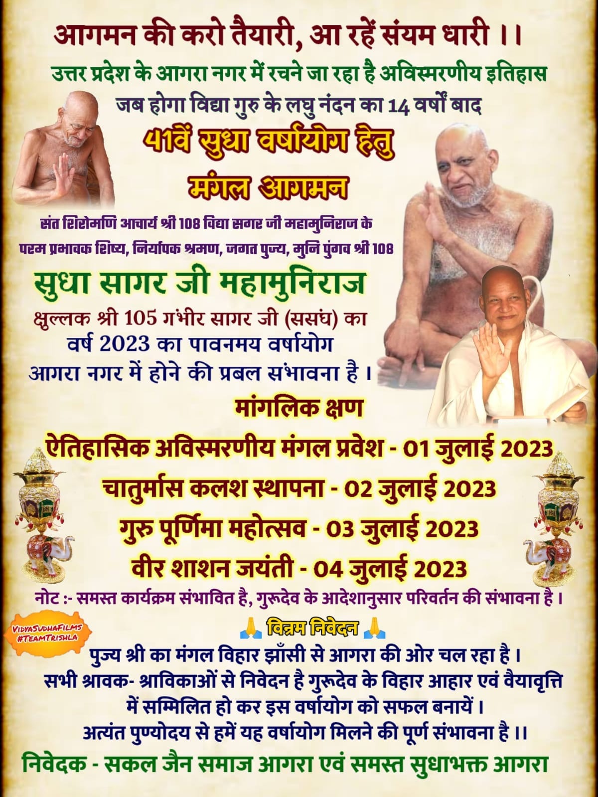 निर्यापक श्रमण मुनि पुंगव श्री सुधासागर महाराज संघ का संभावित वर्षा योग 2023 आगरा में होने की संभावनाओं को देखते हुए आगरा नगर वासियों में हर्ष की लहर है।