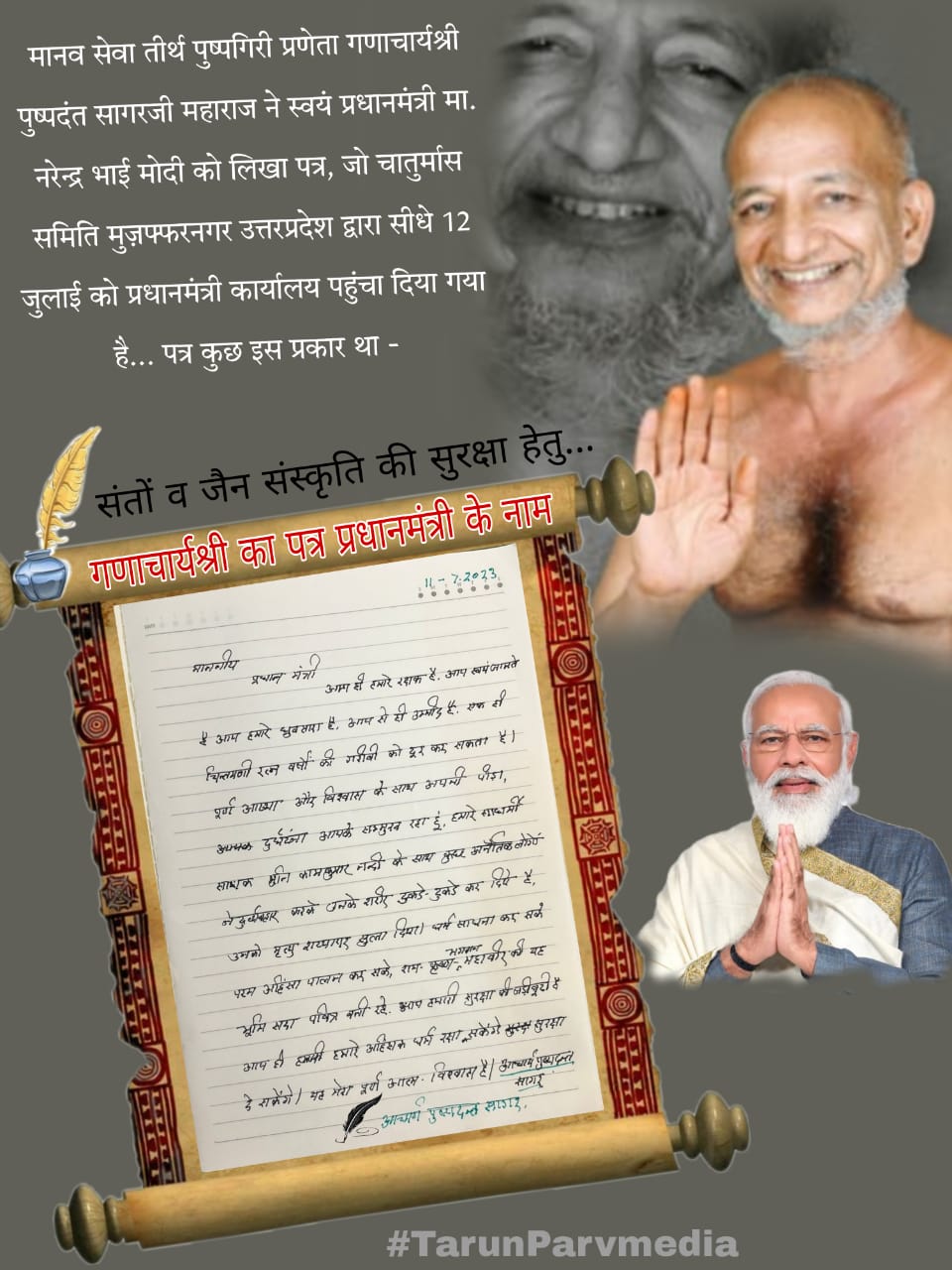 नरेन्द्र भाई मोदी को लिखा पत्र, जो चतुर्मास समिति मुजफ्फरनगर उत्तरप्रदेश द्वारा सीधे 12 जुलाई 2023 को प्रधानमंत्री कार्यालय पहुंचा दिया गया है।