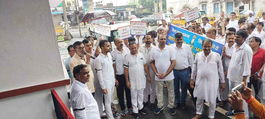 शहर में रविवार को रात्रि मे जोरदार बारिश शुरू हुई जो प्रातः (सोमवार) 10 बजे तक चालु थी लेकिन बारिश की परवाह नहीं करके अपने तय समय से मोन जुलुस मे समाज के लोग तख्तिया लेकर पूरे उत्साह एवम संतो के प्रति श्रद्धा के भाव लेकर बड़ी संख्या मे चल रहे थे वही इस आक्रोश जुलुस पर नज़र डाली जाए तो. इस जुलुस का एक सिरा माल गोदाम चोराहे पर था दूसरा सिरा पन्नालाल चोराहा पर था