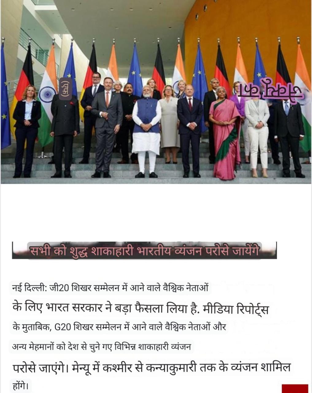 G20 के शिखर सम्मेलन में आने वाले वैश्विक नेताओं को शाकाहारी व्यंजन ही परोसा जाएगा भारत सरकार का बड़ा फैसला।