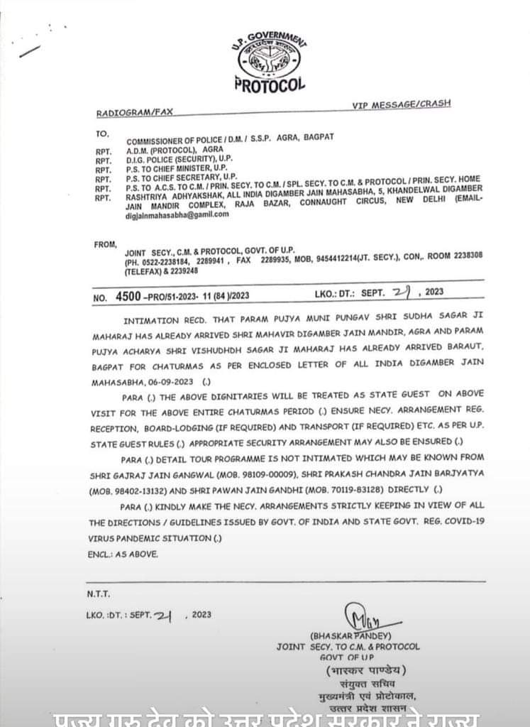 गुरुदेव के कदम के बाद आज जो सूचना मिली है उससे समस्त धर्म प्रेमी बंधुओ में हर्ष की लहर दौड़ गई है पूज्य गुरुदेव को उत्तर प्रदेश सरकार द्वारा राजकीय अतिथि घोषित किया गया है जो अपने आप में एक ऐतिहासिक है। उत्तर प्रदेश सरकार का हमें आभार प्रकट करना चाहिए कि उन्होंने हमारे निर्ग्रंथ संतों के संरक्षण के प्रति कारागर कदम उठाया है।
