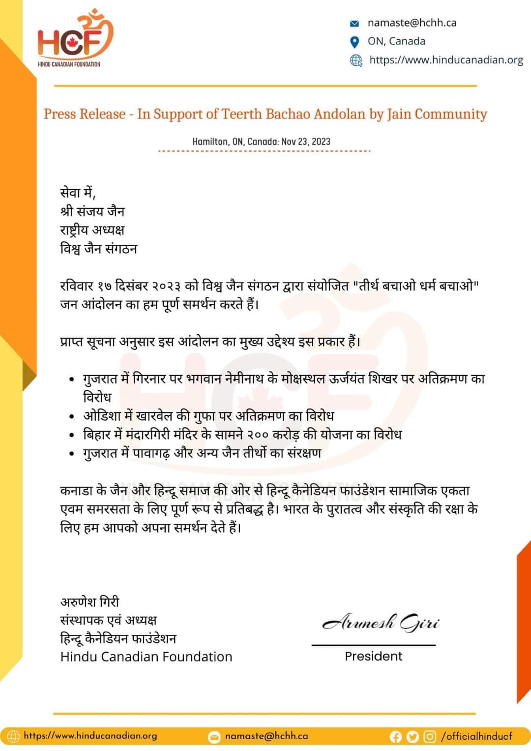 उपरोक्त समर्थन पत्र श्री अरुणेश गिरी कनाडा (संस्थापक HINDU CANADIAN FOUNDATION) से विश्व जैन संगठन द्वारा संयोजित 17 दिसंबर चलो दिल्ली रामलीला मैदान जैन “तीर्थ बचाओ धर्म बचाओ” जन आंदोलन के लिए प्राप्त हुआ ।