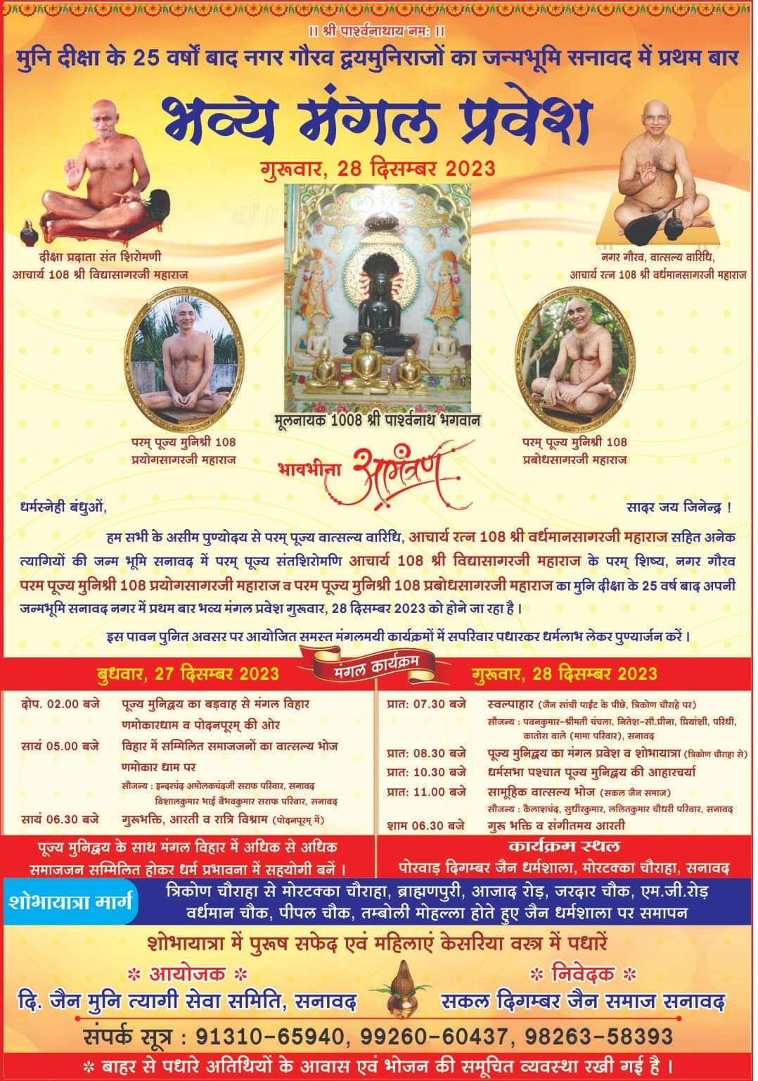 . सन 1998 में मुनि पद प्राप्त करने के उपरांत पिछले 25 वर्षो से नगर नगर धर्म प्रभावना कर रहे है….आचार्य भगवंत की महती कृपा से आगामी 28 दिसंबर को अपने निज नगर सनावद में दीक्षा उपरांत प्रथम बार पधार रहे हैं.। वह..कितना अनुपम दृश्य होगा जब इस नगर की गलियों में खेले बड़े हुए दो बालक अब मुनि अवस्था में यहां की गलियों में पधारेंगे….वर्षो से प्यासी अंखियां जिन्हे अपनी धरा पर देख हर्षातिरेक से भाव विह्वल होंगी…धन्य होंगे वो लोग जो इन पलों के साक्षी बनेंगे।..