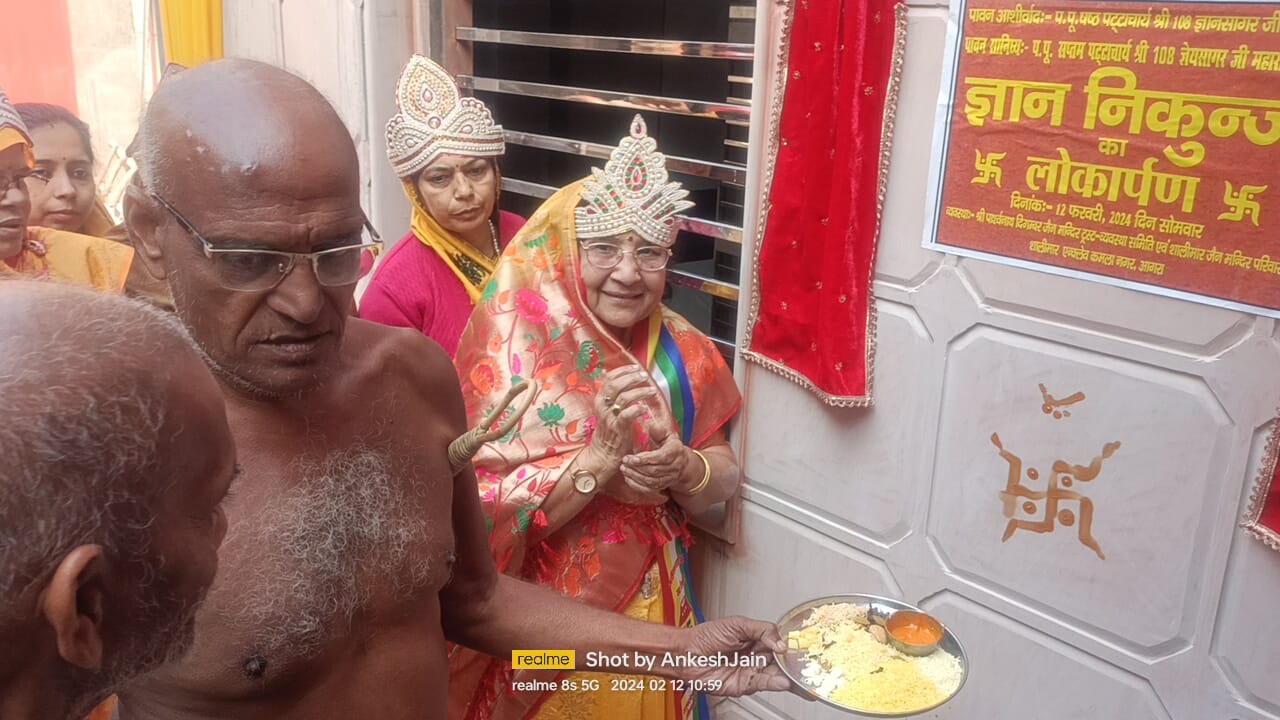 इस दौरान शालीमार एनक्लेव सकल जैन समाज ने आचार्यश्री के समक्ष श्रीफल भेंटकर मंगल आशीर्वाद प्राप्त किया| इसके बाद सौभाग्यशाली परिवारों ने आचार्यसंघ के कुशल निर्देशन में ज्ञान निकुंज संतभवन का फीता खोलकर लोकार्पण किया|