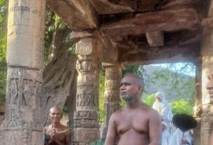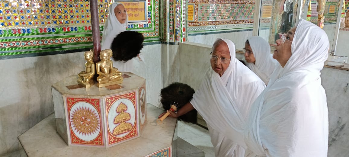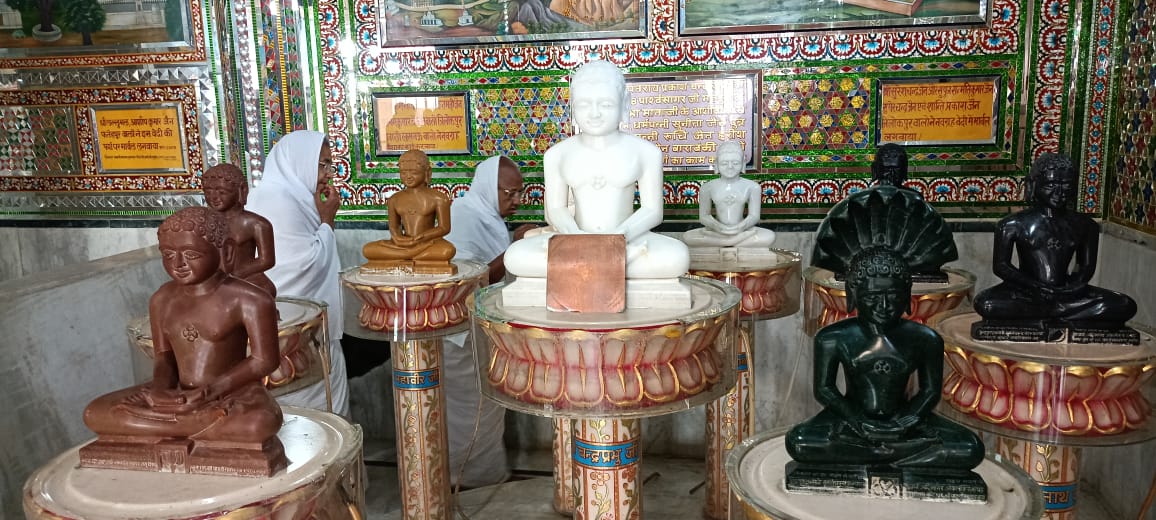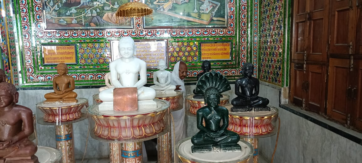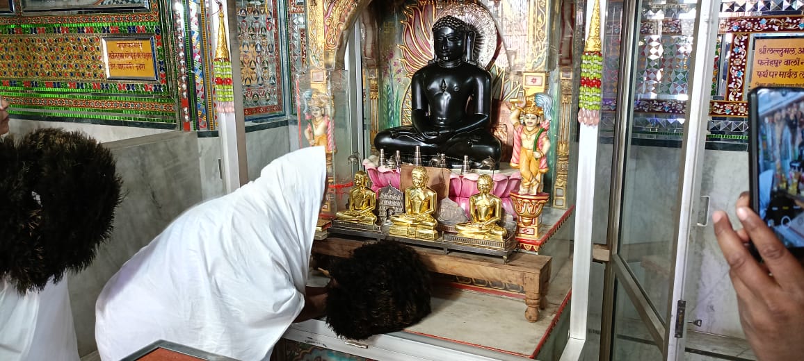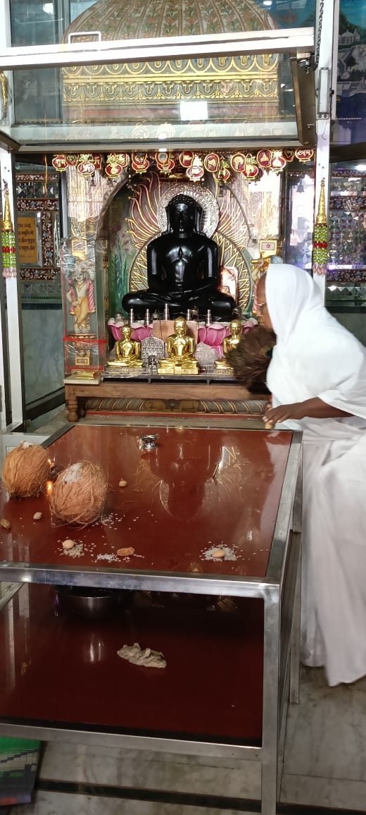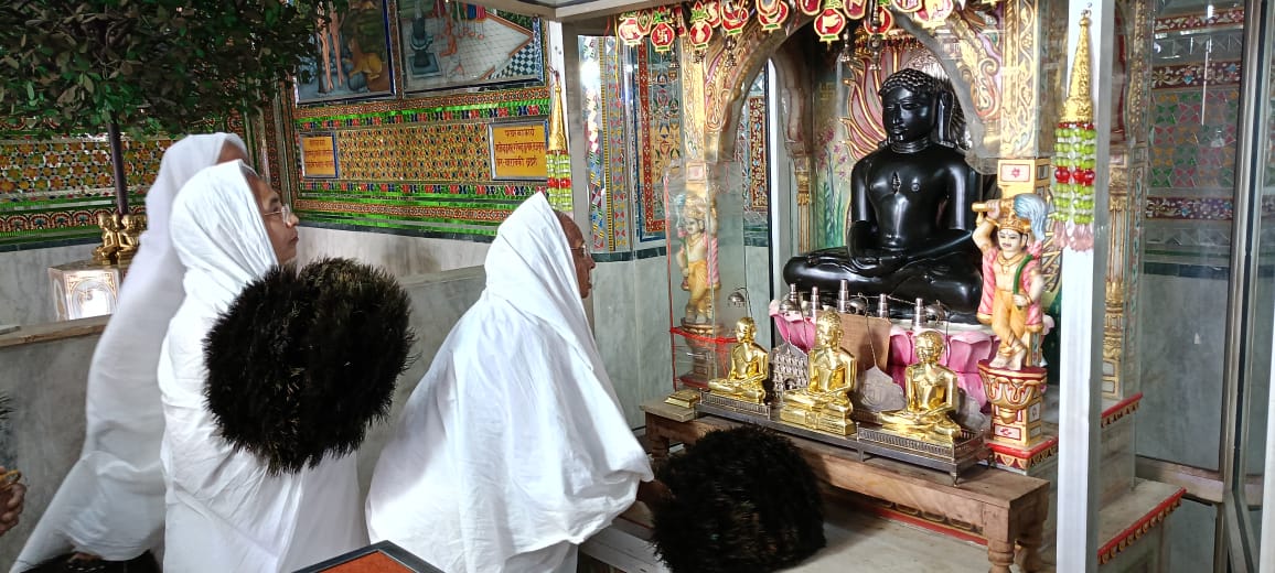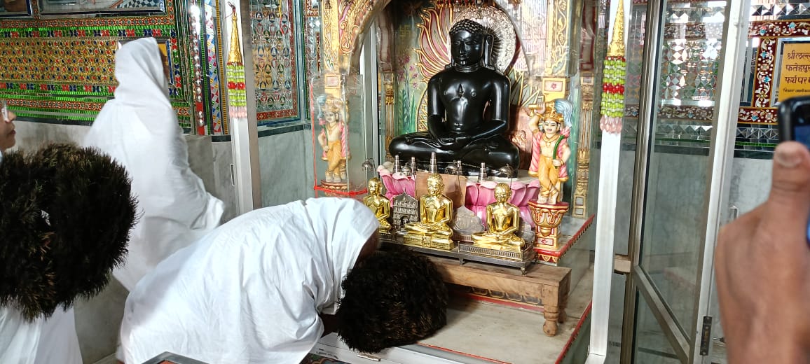 त्रिलोकपुर के अतिशय क्षेत्र में स्थित नेमिनाथ भगवान की प्रतिमा को गुरु मां विशुद्ध मति माताजी संघ ने एक टक निहारा एवं दर्शन किए