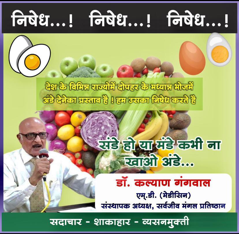 महाराष्ट्र के स्कूलों में बच्चों को अंडा परोसा जा रहा है। जिसको लेकर जिसको लेकर शाकाहार के प्रचार प्रसार में अपनी अहम भूमिका निभाने वाले डॉ कल्याण गंगवाल ने महाराष्ट्र सरकार से मांग की थी कि स्कूलों में अंडा ना परोसा जाए।