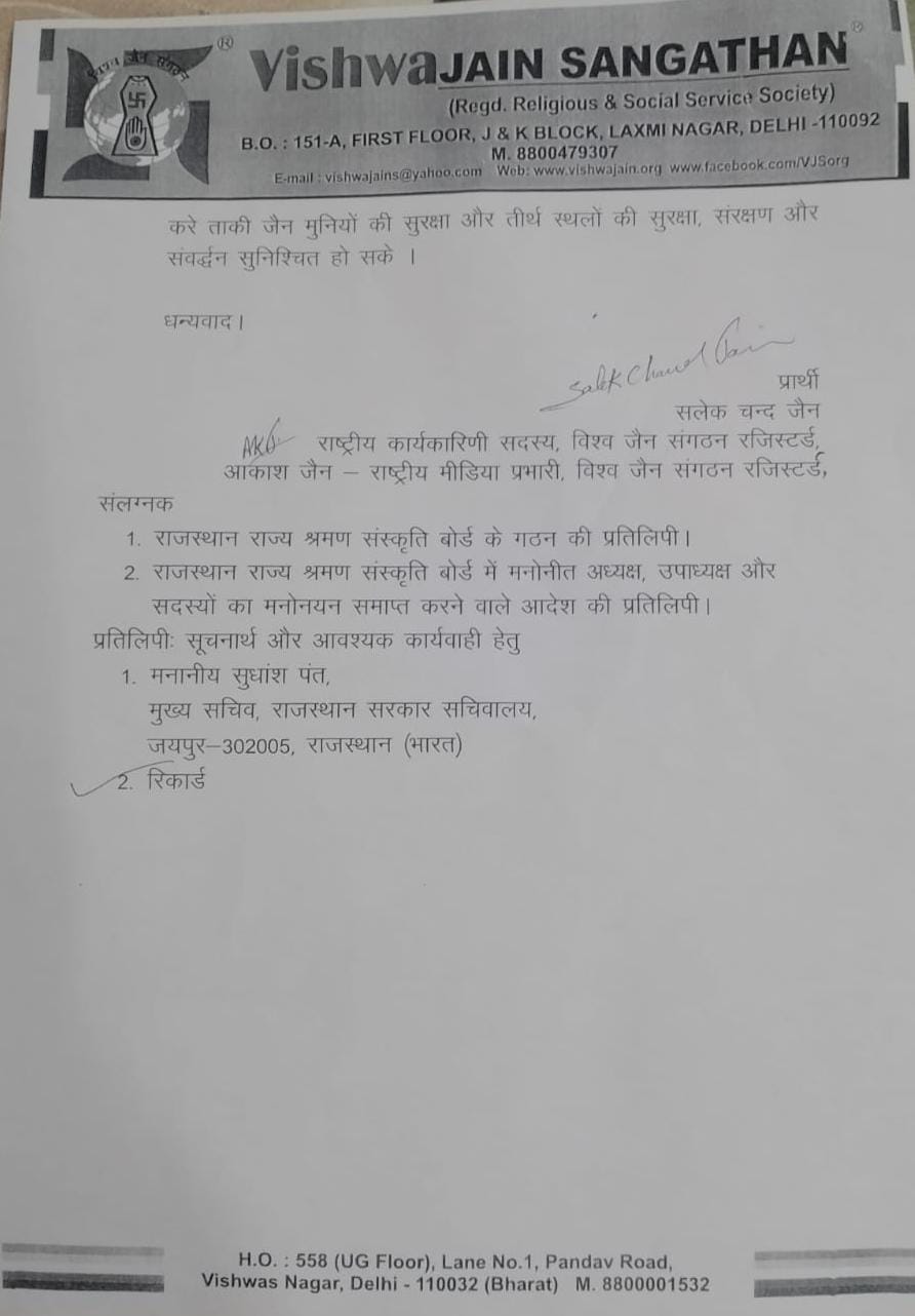 श्री आकाश जैन राष्ट्रीय मीडिया प्रभारी विश्व जैन संगठन ने बताया की जैन धर्म अल्पसंख्यक धर्म हैं और पूरे देश में जैन तीर्थो पर अतिक्रमण व अनिधिकृत कब्जे हो रहे हैं व जैन मुनियों पर आए दिन हमले व अनर्गल टिपणी होती रहती हैं। राजस्थान राज्य में जैन मुनियों की सुरक्षा , जैन तीर्थो की सुरक्षा सरक्षण और संवर्धन हेतु राजस्थान राज्य श्रमण संस्कृति बोर्ड में अध्यक्ष एवम सदस्यो का मनोनयन अति आवश्यक हैं।