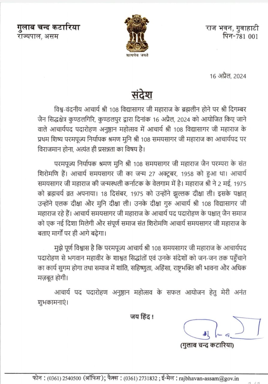 एक पत्र संदेश के माध्यम से उन्होंने पत्र में लिखा है कि विश्व वंदनीय आचार्य श्री 108 विद्यासागर जी महाराज के ब्रह्मलीन होने पर श्री दिगंबर जैन सिद्ध क्षेत्र कुंडल गिरी कुंडलपुर में दिनांक 16 अप्रैल 2024 को आयोजित किए जाने वाले आचार्य पदारोहण अनुष्ठान महोत्सव में आचार्य श्री 108 विद्यासागर जी महाराज के प्रथम शिष्य परम पूज्य निर्यापक मुनि श्री 108 समय सागर जी महाराज का आचार्य पद पर विराजमान होना अत्यंत ही प्रसन्नता का विषय है।