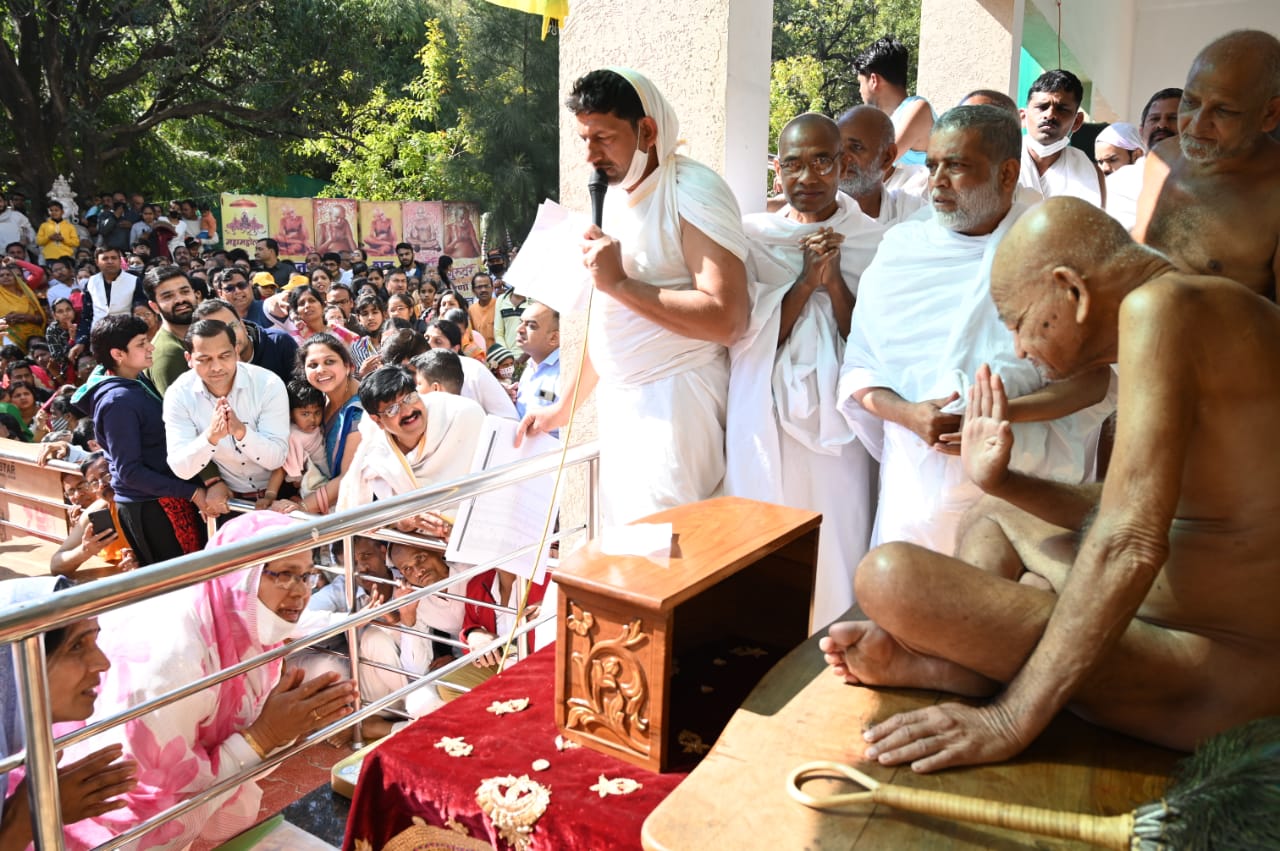 जीवन में भावों की योग्यता अवश्य रखें~आचार्य श्री विद्यासागर जी महाराज दमोह। सिद्ध क्षेत्र कुण्डलपुर के छोटे बाबा आचार्य श्री विद्यासागर जी महाराज ने कुण्डलपुर महामहोत्सव के शुभ अवसर पर संदेश देते हुए कहा कि अपने जीवन में मुख्य रूप से भावों की योग्यता अवश्य रखें, भावों में शुद्धता और निर्मलता होगी तो जीवन का विकास निश्चित ही होगा। आचार्य श्री ने कहा जिस प्रकार नहर में पानी छोड़ते ही बह तेज प्रवाह के साथ आगे बढ़ता है वैसे ही भावों में निर्मलता आने से जीवन वैराग्य पथ की ओर तेज गति से बड़ने लगता है। कुण्डल पुर महामहोत्सव मे भी भक्ति की लहर आ रही हैं और केवल मनुष्य ही नहीं बल्कि स्वर्ग लोक से देवता भी इस महामहोत्सव में आयेगे यह निश्चित है, आचार्य श्री विद्यासागर जी महाराज ने सम्पूर्ण जैन समाज को संदेश दिया कि कुण्डलपुर महामहोत्सव में भावों के साथ भाग लेकर अपने जीवन को सफल बनाएं, जिसका पुण्य तेज होगा वह पात्र बनकर विशेष पुण्य कमाएगा, कभी कभी पुण्य उदय में रहता है पर उदीरणा नहीं हो पाती, इसलिए अपने भावों को धर्ममय बनाएं रखें। आज बड़े बाबा भगवान आदिनाथ के जप अनुष्ठान से महामहोत्सव का शुभारम्भ किया गया। आज आचार्य श्री को नवधा भक्ति भाव से आहार देने का सौभाग्य इंदौर निवासी अनिल जैन और उनके परिजनों को प्राप्त हुआ। प्रवचन पूर्व आचार्य श्री को शास्त्र भेंट करने का सौभाग्य शंकर लाल जी जैन, अशोक पटनी परिवार, अर्हम जैन, प्रकाश चंद जैन को प्राप्त हुआ।