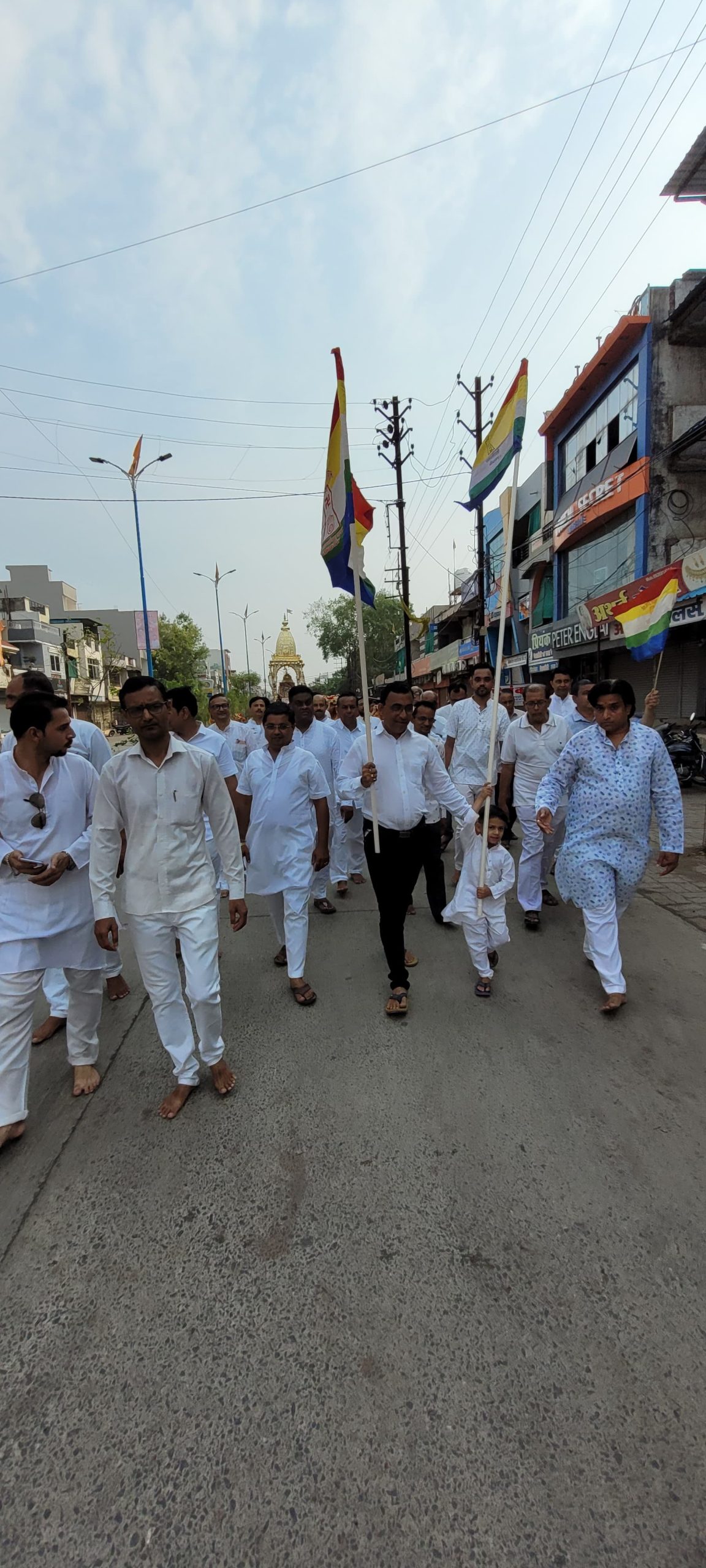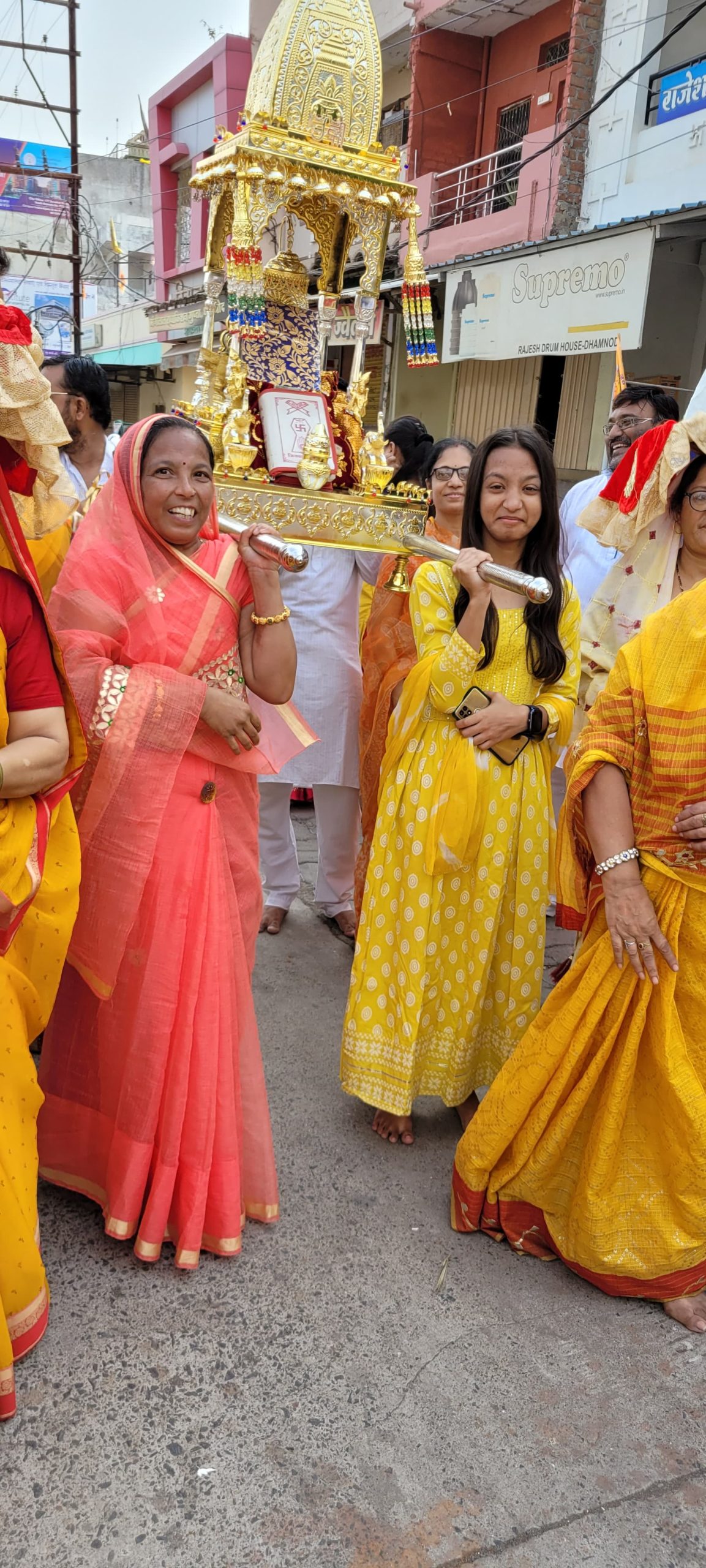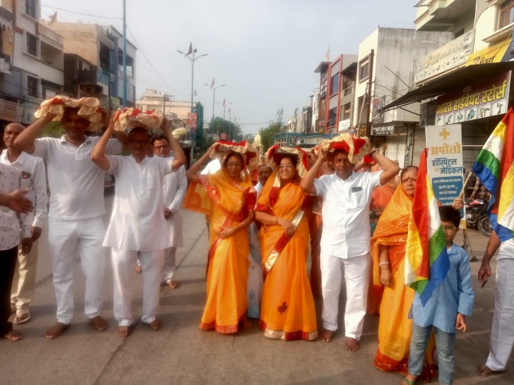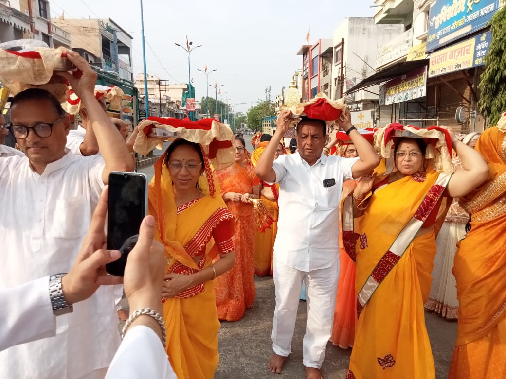 चल समारोह ढोल धमाकों के साथ नगर के मुख्य मार्गो से महेध्वर फाटे पर पहुचा मार्गो में जगह जगह बेदी पर विराजमान ग्रन्थ जिनवाणी की आरती समाजनो के दुवारा की जा रही थी समाजजन व युवाजन जैन धर्म की ध्वजा लेकर चल रहे थे व जिनवाणी माता की जय जय के जयकारे भी लगा रहे थे