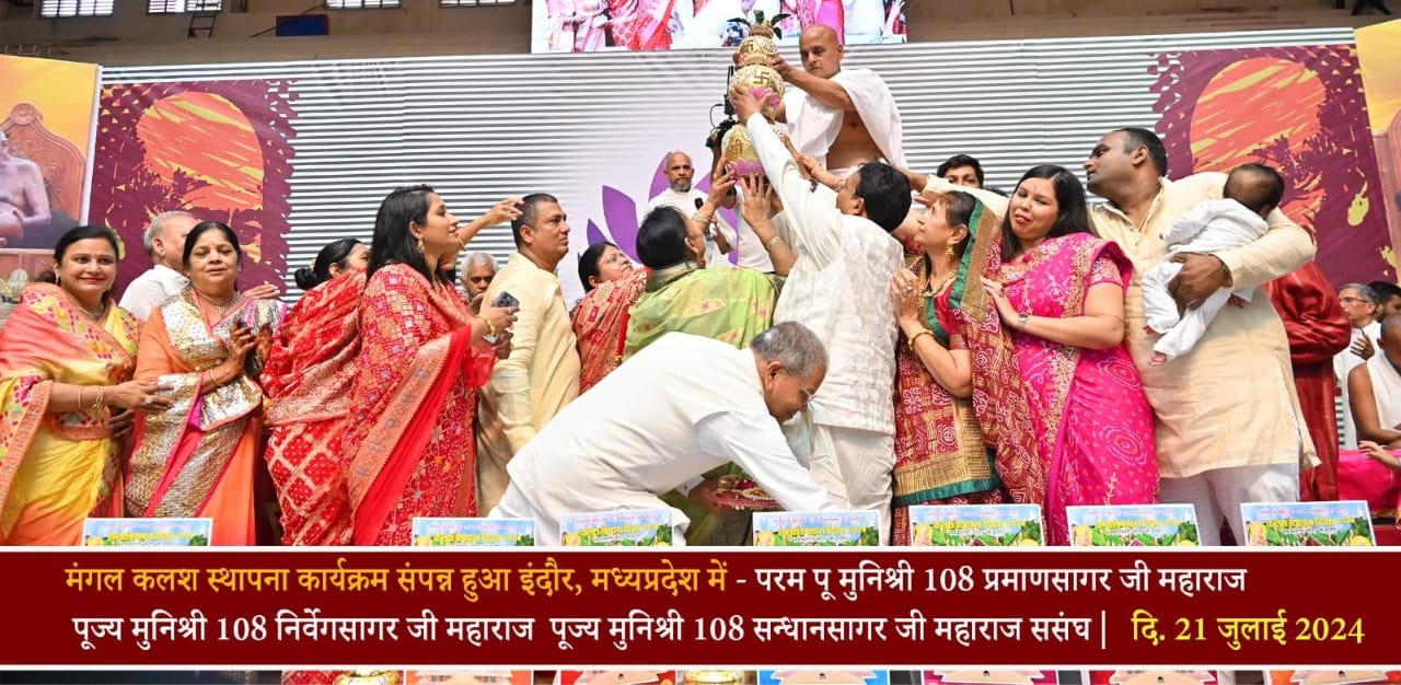 शंका-समाधान प्रणेता मुनिश्री प्रमाणसागर जी महाराज,पाठशाला प्रणेता मुनि श्री निर्वेग सागर महाराज, मुनिश्री संघान सागर महाराज ससंघ की विधिवत चातुर्मास कलश की स्थापना औद्योगिक नगरी इंदौर के रेसकोर्स रोड़ पर रविवार 21 जुलाई को दौपहर दो बजे से अभय प्रशाल में कि गई।