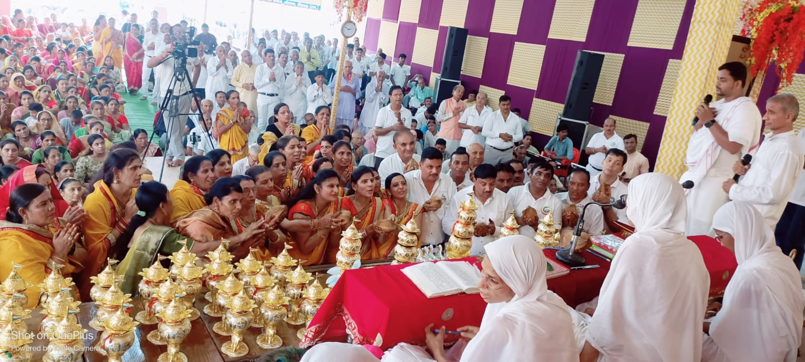 ध्वजारोहण करने का सौभाग्य वर्धमान हॉस्पिटल धनपाल जी मोतीलाल जी बांसवाड़ा को प्राप्त हुआ मंगलाचरण के बाद अष्टद्रव्य के थाल सजाकर बड़े भक्ति भाव से महिलाओं द्वारा नाचते गाते हुए अर्ध चढ़ाए गए उनके माध्यम से इस अवसर पर जिनवाणी चैनल के माध्यम से कार्यक्रम का प्रसारण किया गया इसके उपरांत विभिन्न गांव से पधारो हुए सभी पांच महानुभावों का श्री समाज द्वारा दुपट्टा उड़ा कर पगड़ी पहनकर स्वागत किया गया पांच मुख्य कलशों की बोली आदिनाथ कलश नेमिनाथ कलश गुरुवार ज्ञान सागर कलश समय सागर कलश विवेक सागर विवेक सागर कलश की बोलीया हुई प्रथम कलश प्राप्त करने का सौभाग्य गांधी राजेंद्र कुमार मीठालाल सुरभि मोटर्स नोगामा द्वितीय कलश पंचोरी कैलाश चंद्र केसरीमल जी मोदी परिवार तृतीय कलश राकेश कुमार रतनलाल जी चतुर्थ कलश हित कुमार दीपेश कुमार हीरालाल जी गांधी पंचम कलश चातुर्मास कमेटी के अध्यक्ष निलेश कुमार जीतमल जी को प्राप्त हुआ एवं साथी सभी उपस्थित धर्म प्रेमी बंधुओ द्वारा 101 कलश बोली के माध्यम से प्राप्त हुए इस अवसर पर माताजी को जिनवाणी भेंट करने का सौभाग्य खुशपाल जी जैन वर्धमान हॉस्पिटल बांसवाड़ा को प्राप्त हुआ