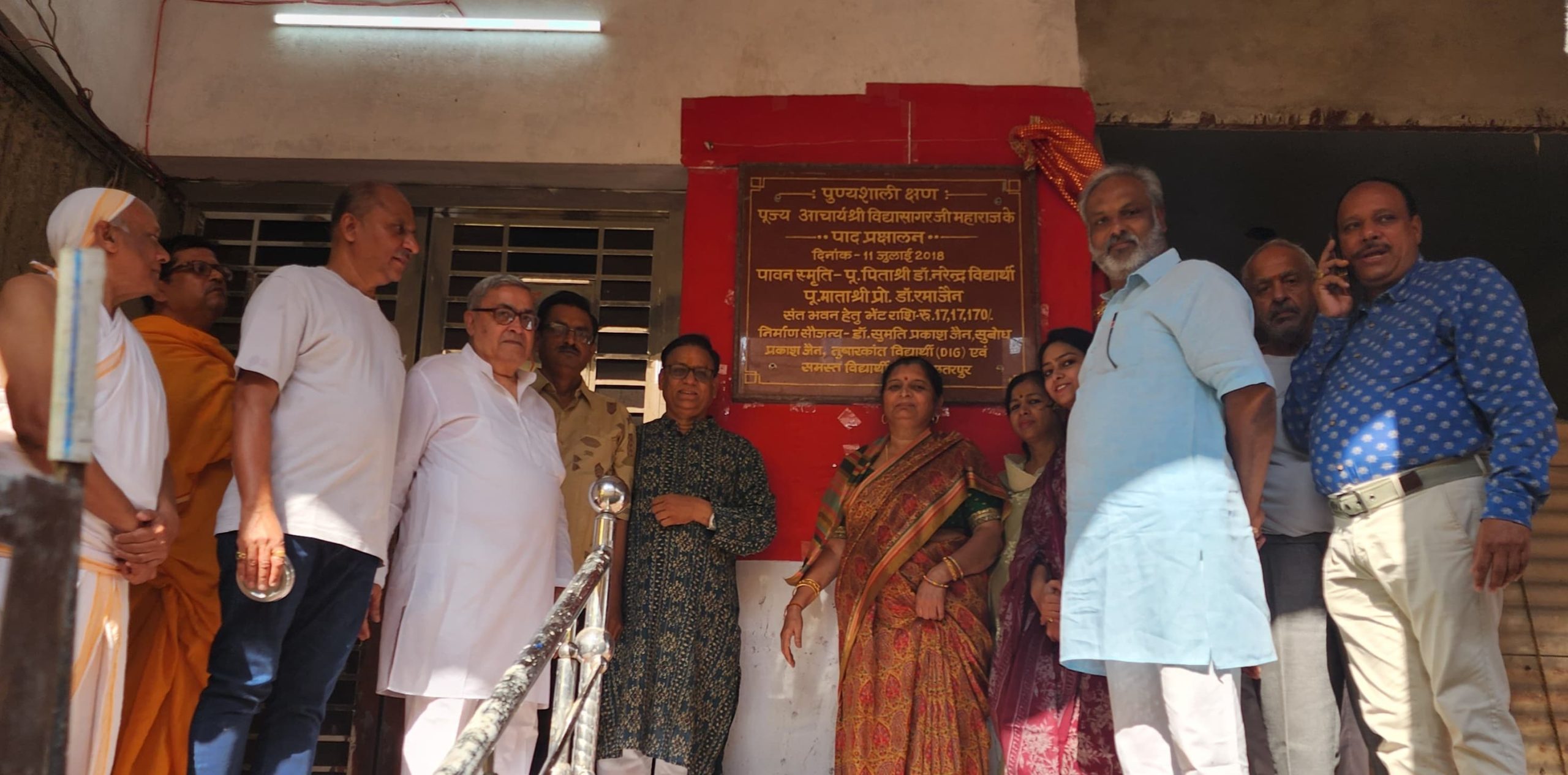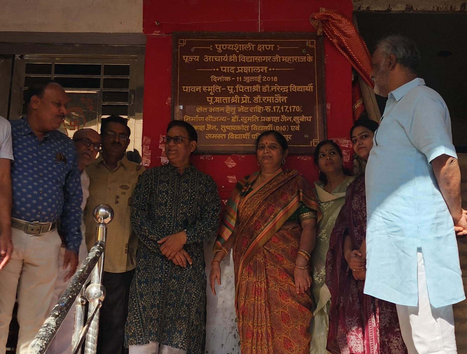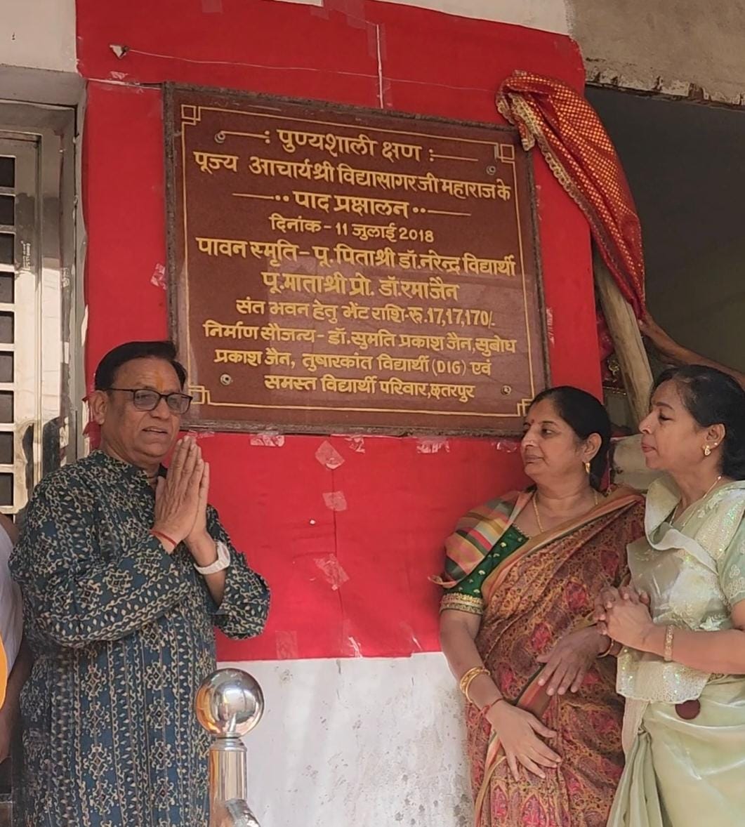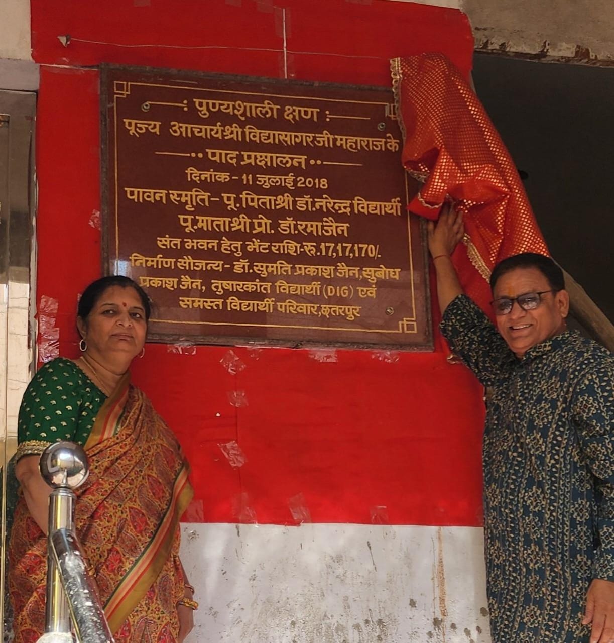 थे। प्रवचन के पूर्व आचार्यश्री के पाद प्रक्षालन कर उनका मंगल आशीर्वाद पाने का सौभाग्य प्रो.सुमति प्रकाश जैन, डा. अर्चना जैन,श्री सुबोध प्रकाश जैन, दीप्ति जैन ,श्री तुषार कांत विद्यार्थी एवं कामना विद्यार्थी को मिला था।पाद प्रक्षालन के शुभ प्रसंग पर पिताश्री स्व. डा नरेंद्र विद्यार्थी एवं प्रो. रमा जैन की पावन स्मृति में प्रो. सुमति प्रकाश जैन एवं प्रो अर्चना जैन ,विद्यार्थी परिवार ने अपने वेतन से सत्रह लाख, सत्रह हजार एक सौ सत्तर रुपए की राशि संत भवन के निर्माण हेतु भेंट करने का संकल्प लिया था।