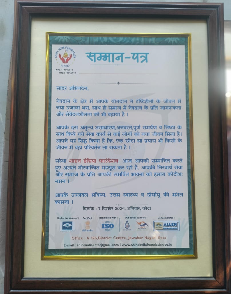 शाइन इंडिया फाउंडेशन के संजय बीजावत ने भी यह सम्मान प्राप्त किया,व नैत्रदान में सदैव सहयोग के लिये मोनू माहेश्वरी व वर्धमान डांगी को यह सम्मान प्रदान किया जावेगा।