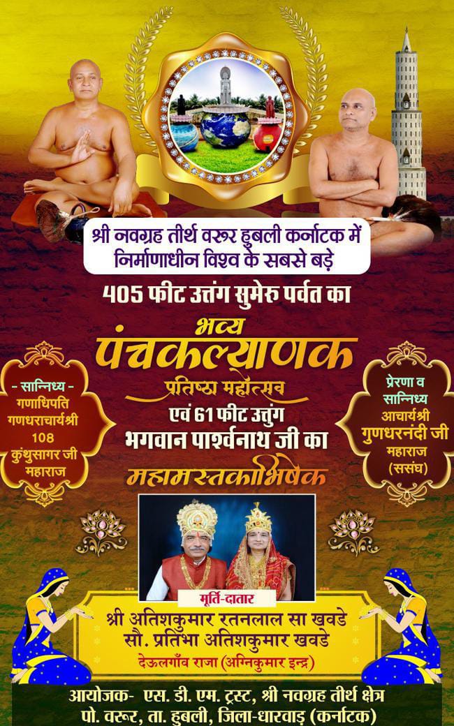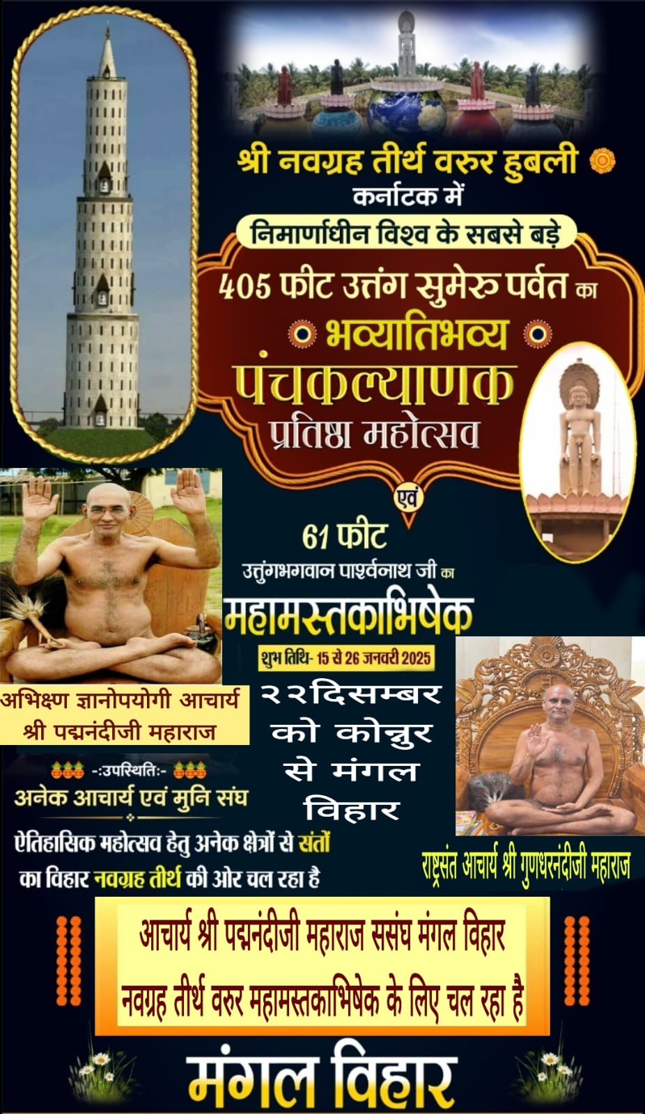 कर्नाटक के प्रमुख नगर हुबली मे नवगृह तीर्थ वरुर हुबली मे 15 से 26 जनवरी 2025 तक भव्य पञ्चकल्याणक महोत्सव होने जा रहा है जिसमे अनेको संतो के आगमन होने की संभावना है यह आयोजन अपने आप मे अनुपम है यह क्षेत्र विश्व की अनुपम कृति के रूप मे जाना जाएगा यहाँ विश्व के सबसे बडे 405 फीट उतंग सुमेरु पर्वत का भव्य पञ्चकल्याण महोत्सव सम्पन्न होने जा रहा है इस अभूतपूर्व महोत्सव अपना पावन सानिध्य प्रदान करने हेतु अभीक्ष्णं ज्ञानोपयोगी संत आचार्य श्री 108 पद्मनंदी जी महाराज का कोन्नुर से 22 DEC 2024 को मंगल विहार हुआ