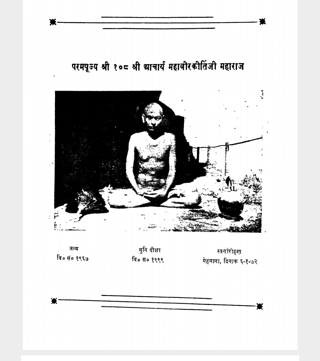 53 वे अंतर विलय समाधि वर्ष दिनांक 6 जनवरी 1972 माघ कृष्ण छठ पर नमोस्तु नमोस्तु नमोस्तु फिरोजाबाद में श्रीमती बूंदी बाई रतन लाल जी के यहां पांच पुत्रों में तीसरे पुत्र महेंद्र जी का जन्म वैशाख वदी नवमी विक्रम संवत 1967 तीन मई 3 सन 1910 को हुआ। 10 वर्ष की उम्र में आपकी माता जी का निधन हो गया बचपन से आप में वैराग्य की भावना बलवती होती रही आचार्य कल्प श्री चंद्रसागर जी महाराज से अपने 7 प्रतिमा ब्रह्मचर्य व्रत धारण किया। प्रथमाचार्य चारित्रचक्रवर्ती