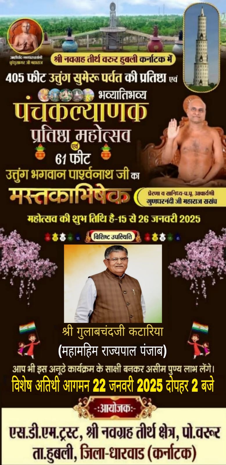 नवग्रह तीर्थ वरुर कमेटी से मिली जानकारी अनुसार 22 जनवरी की दोपहर बेला में पंजाब सरकार के राज्यपाल श्रीमान गुलाबचंद कटारिया इस आयोजन में अपनी सहभागिता प्रदान करेंगे एवं इस अलौकिक तीर्थ के दर्शन करेंगे दर्शन कर समस्त संतों का आशीर्वाद लेंगे। आपको बता दें कि श्री कटारिया संतो के प्रति समर्पित रहते हैं एवं जैन समाज के होने वाले समस्त कार्यक्रमों में अपनी सहभागिता प्रदान करते हैं।