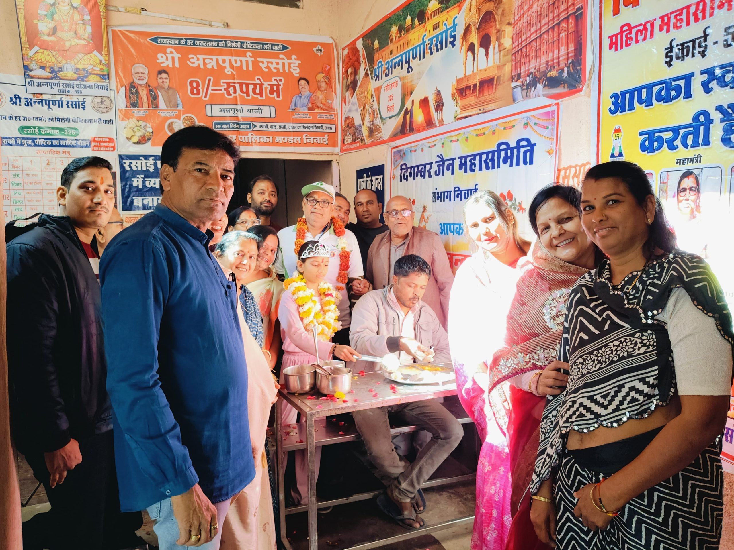 कार्यक्रम में विशिष्ट अतिथि भाजपा नेता मनोज पाटनी, हितेश छाबड़ा, विमल सोगानी, संजय सोगानी एवं मंयक छाबड़ा रहे। अन्नपूर्णा रसोई में 13 फरवरी को कार्यक्रम की शुरुआत नन्ही बालिका नेहल जैन पाटनी जौंला के हाथों से निःशुल्क भोजन के साथ करवाया। उन्होंने बताया कि महिला महासमिति ईकाई 5 के महामंत्री शकुंतला महावीर प्रसाद छाबड़ा की विवाह वर्षगांठ एवं महासमिति संभाग मंत्री विमल जौंला की पुत्री नेहल जैन पाटनी के जन्मदिन के पावन अवसर पर आयोजित कार्यक्रम में जरुरत मंद लोगों को निःशुल्क भोजन करवाया गया।