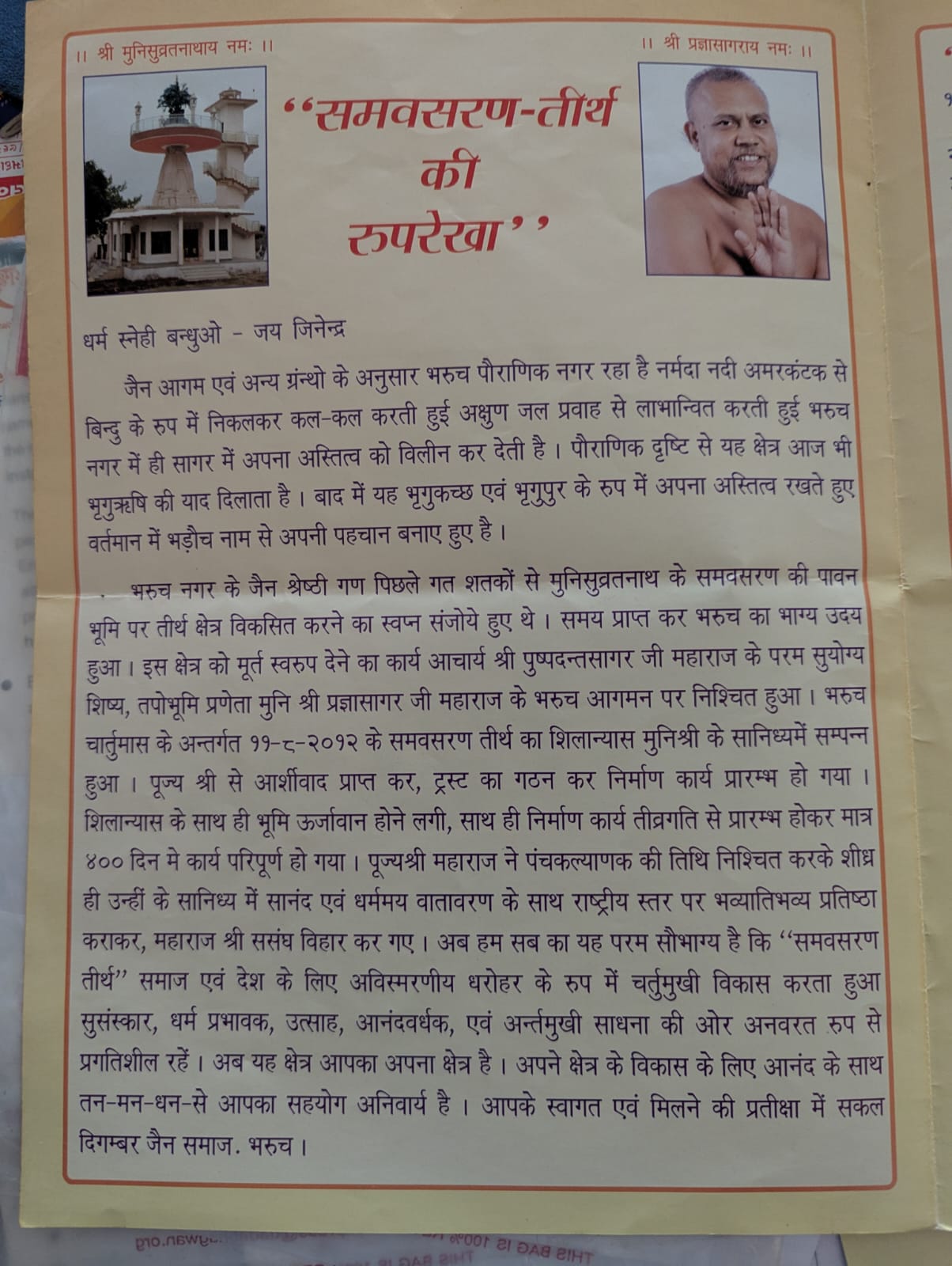 भरुच नगर के जैन श्रेष्ठीगण पिछले गत शतकों से मुनिसुव्रतनाथ के समवसरण की पावन भूमि पर तीर्थ क्षेत्र विकसित करने का स्वप्न संजोये हुए थे। समय प्राप्त कर भरुच का भाग्य उदय हुआ। इस क्षेत्र को मूर्त स्वरुप देने का कार्य आचार्य श्री पुष्पदन्तसागर जी महाराज के परम सुयोग्य शिष्य, पर्यावरण संरक्षक तपोभूमि प्रणेता आचार्य श्री 108 प्रज्ञासागर जी महाराज के भरुच आगमन पर निश्चित हुआ । भरुच