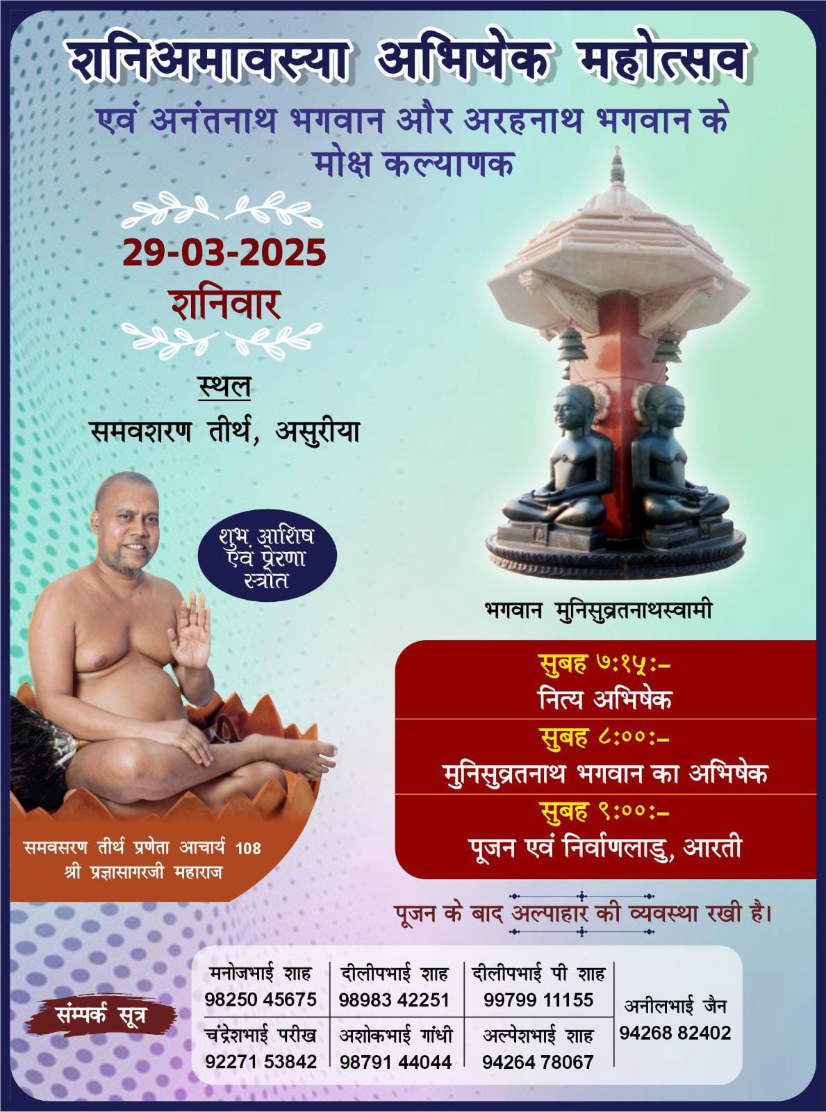 परम पूजनीय तपोभूमि प्रणेता पर्यावरण संरक्षक आचार्य श्री 108 प्रज्ञा सागर महाराज की प्रेरणा से निर्मित समवशरण तीर्थ असुरिया गुजरात में शनि अमावस्या एवम भगवान अनंतनाथ, भगवान अरहनाथ के मोक्ष कल्याणक महोत्सव के अवसर पर 29 मार्च 2025 को विशेष अभिषेक किया जाएगा एवं महा महोत्सव मनाया जाएगा।
