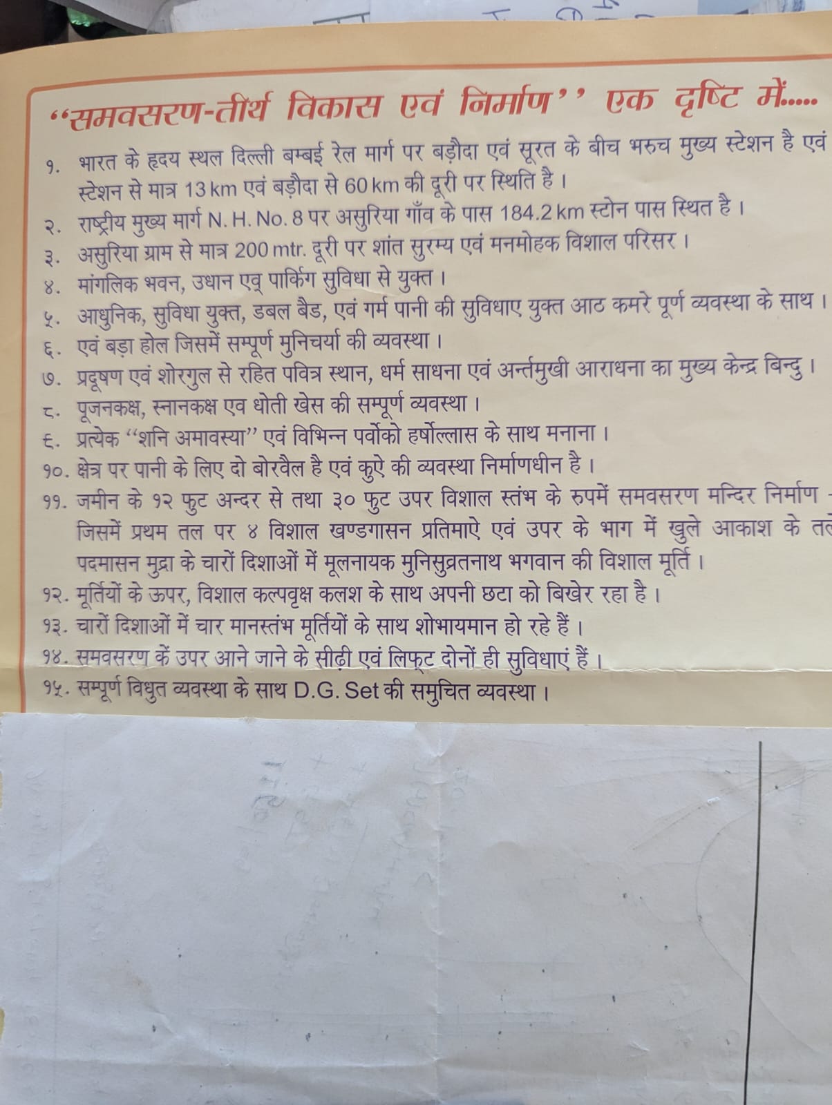 चार्तुमास के अन्तर्गत 11 अगस्त 2012 में समवसरण तीर्थ का शिलान्यास आचार्य श्री के सानिध्य में सम्पन्न हुआ।पूज्य श्री से आर्शीवाद प्राप्त कर, ट्रस्ट का गठन कर निर्माण कार्य प्रारम्भ हो गया और इसका परिणाम यह हुआ कि शिलान्यास के साथ ही भूमि ऊर्जावान होने लगी, साथ ही निर्माण कार्य तीव्रगति से प्रारम्भ होकर मा त्र400 दिन मे कार्य परिपूर्ण हो गया। पूज्यश्री महाराज ने पंचकल्याणक की तिथि निश्चित करके शीघ्र ही उन्हीं के सानिध्य में सानंद एवं धर्ममय वातावरण के साथ राष्ट्रीय स्तर पर भव्यातिभव्य प्रतिष्ठा कराकर महाराज श्री संघ सहित विहार कर गए। अब हम सब का यह परम सौभाग्य है कि “समवसरणतीर्थ” समाज एवं देश के लिए अविस्मरणीय धरोहर के रुप में चर्तुमुखी विकास करता हुआसुसंस्कार, धर्म प्रभावक, उत्साह, आनंदवर्धक, एवं अर्न्तमुखी साधना की ओर अनवरत रूप से प्रगतिशील रहे।