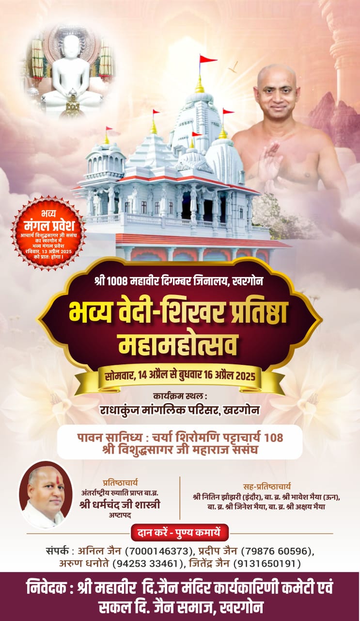 * मंदिर समिति ने निमाड़ गौरव जैन संत श्री पूज्य सागर जी महाराज को आमंत्रित किया है, जो वर्तमान में सनावद, मध्य प्रदेश में विराजमान हैं।