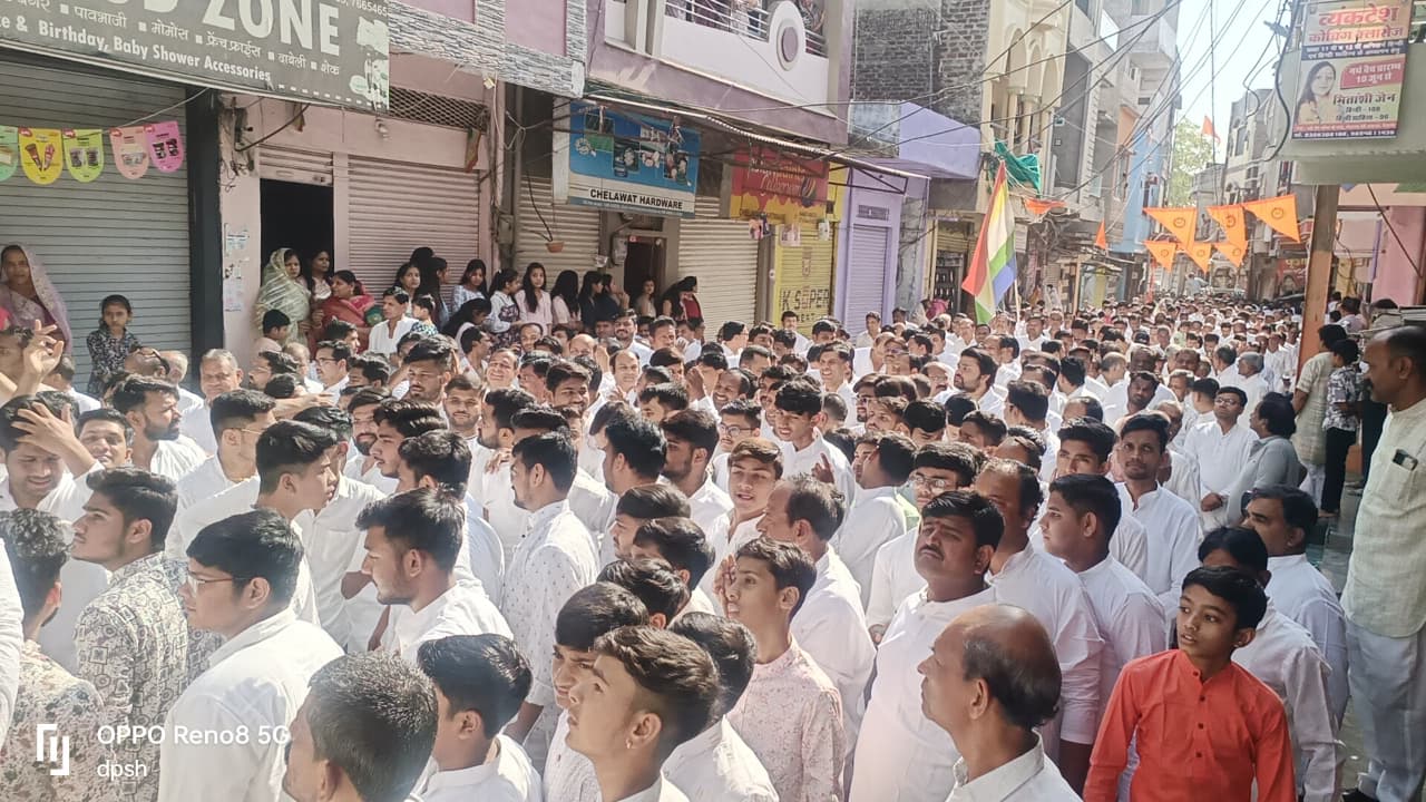 उसके बाद बड़े मन्दिर से शोभायात्रा बेण्ड़ बाजों व ढ़ोल के साथ रजत रथ में निकाली गई जो कि पिपली चौक, शहर मौहल्ला, सेठान मौहल्ला,खांण्डुपुरा, नयापुरा होते हुवे मांगलिक भवन पहुंची शोभायात्रा में मनीष शास्त्री सन्मति शास्त्री, आशीष जैन, मुकेश चेलावत,अक्षु,मिन्टु,वन्दन, हितेश आदि के द्वारा भक्ति करवाईं गई। जिसमें श्रावकों ने झुम झुमकर भक्ति करते हुवे गा रहे थे “अरे आनन्द आया रे, महावीर जन्म कल्याण में, शोभायात्रा में श्रावक सफेद वस्त्र में व श्राविकाएं मण्डल की व केसरिया साड़ी पहन कर नंगेपेर भक्ति करते हुवे चल रहे थे।