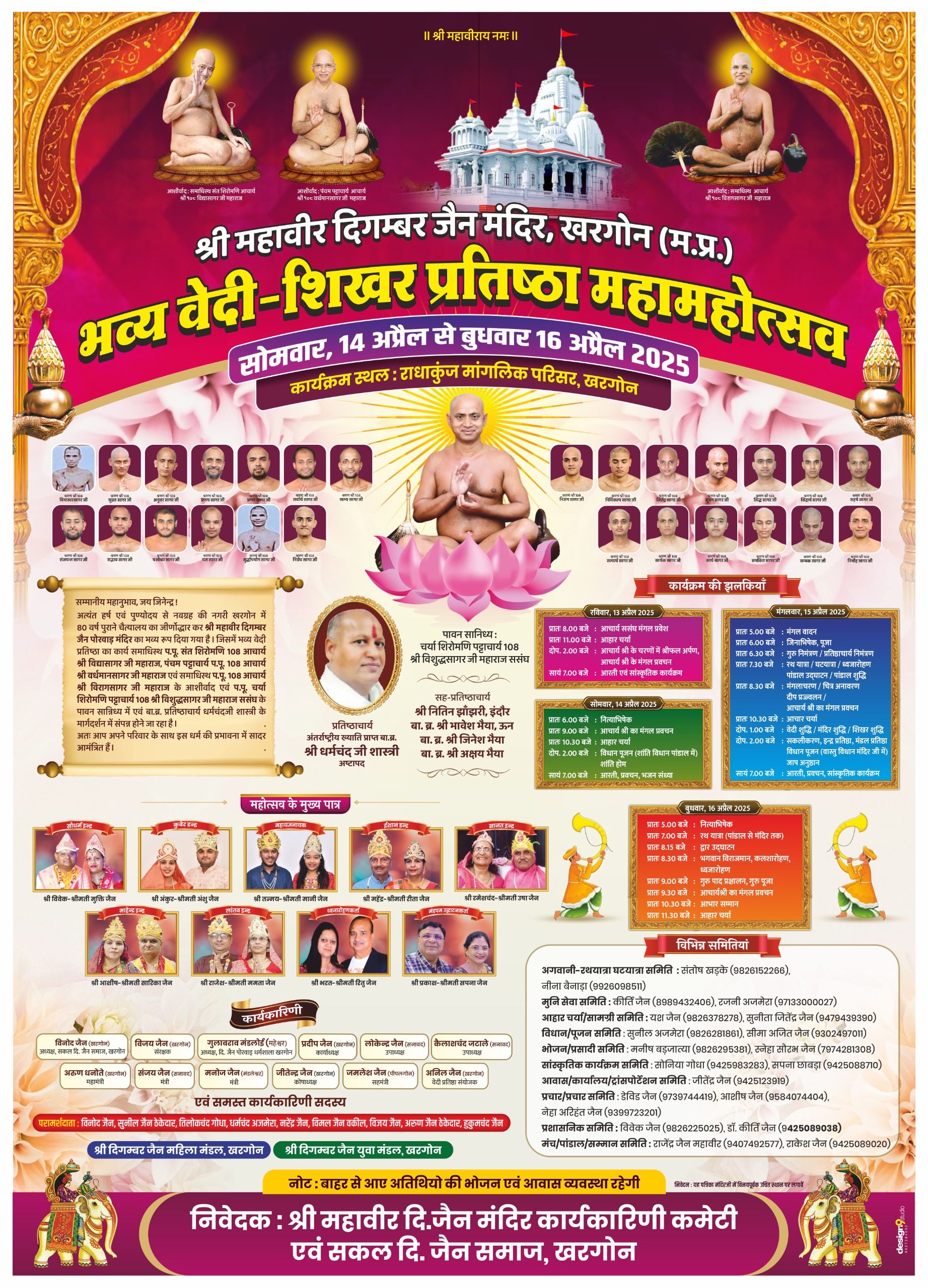 श्री जैन मंदिर खरगोन में आगामी वेदी प्रतिष्ठा महोत्सव के लिए तैयारियां अपने अंतिम चरण में हैं। यह भव्य धार्मिक आयोजन स्थानीय सरकारी प्रशासन, उद्योग जगत, कॉर्पोरेट क्षेत्र, विभिन्न संघों, वाणिज्य मंडल और प्रमुख राजनीतिक व्यक्तियों सहित गणमान्य अतिथियों की उपस्थिति में आयोजित किया जाएगा।