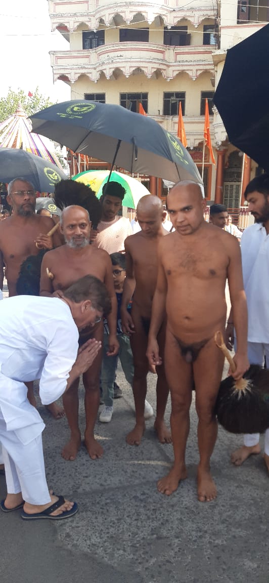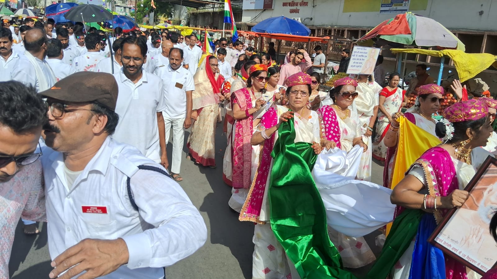 उनकी अगवानी में सर्वप्रथम भीकनगांव से आए बैंड ने भक्तिमय भजनों को सुनाया महिला शक्ति भक्ति नृत्य करते हुए चल रही थी। आचार्य श्री के संघ के पीछे रथ में होने वाली विराजमान प्रतिमाओं को रखा गया था। घोड़े पर सवार युवा धर्म ध्वज लेकर चल रहे थे।