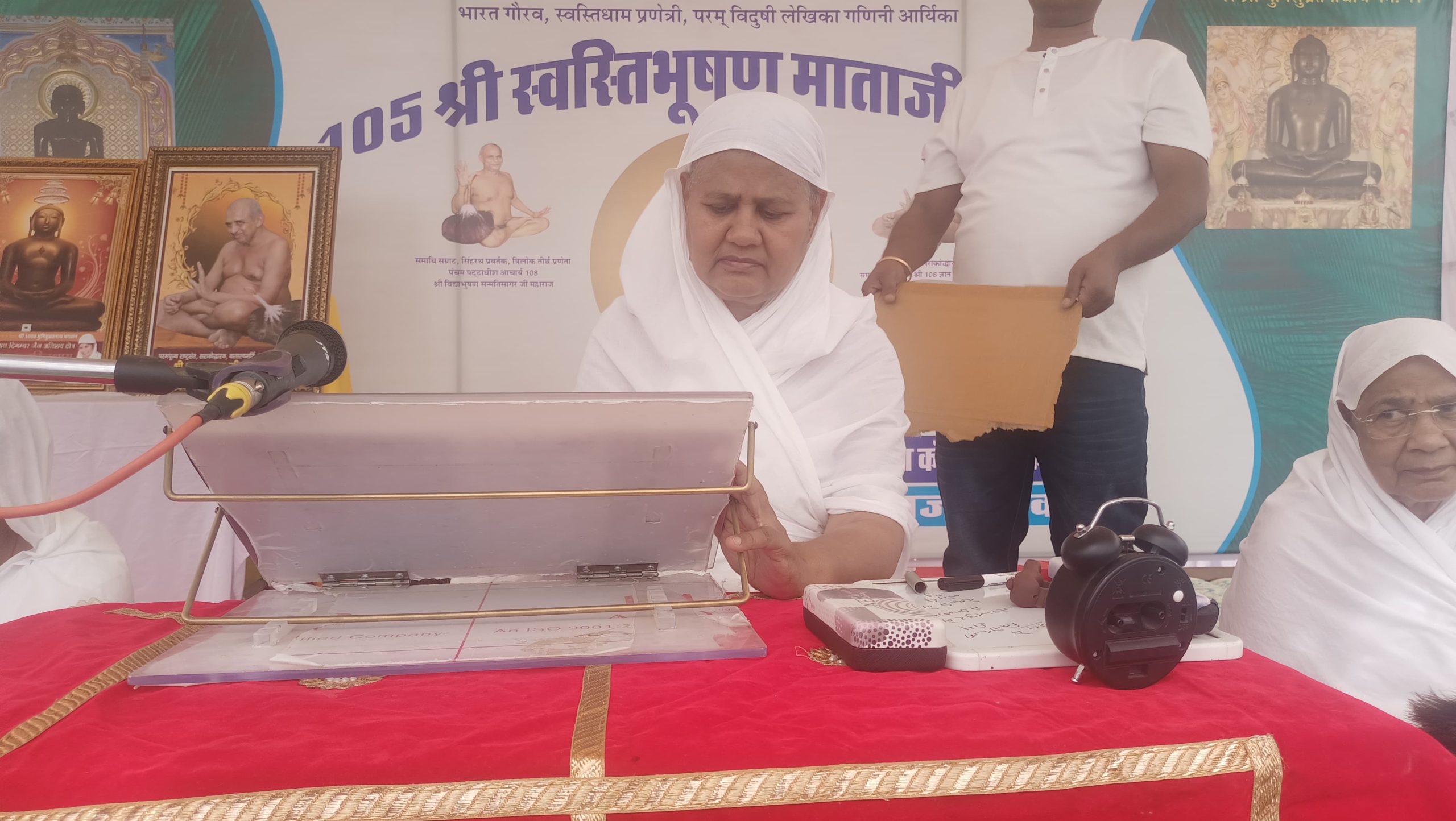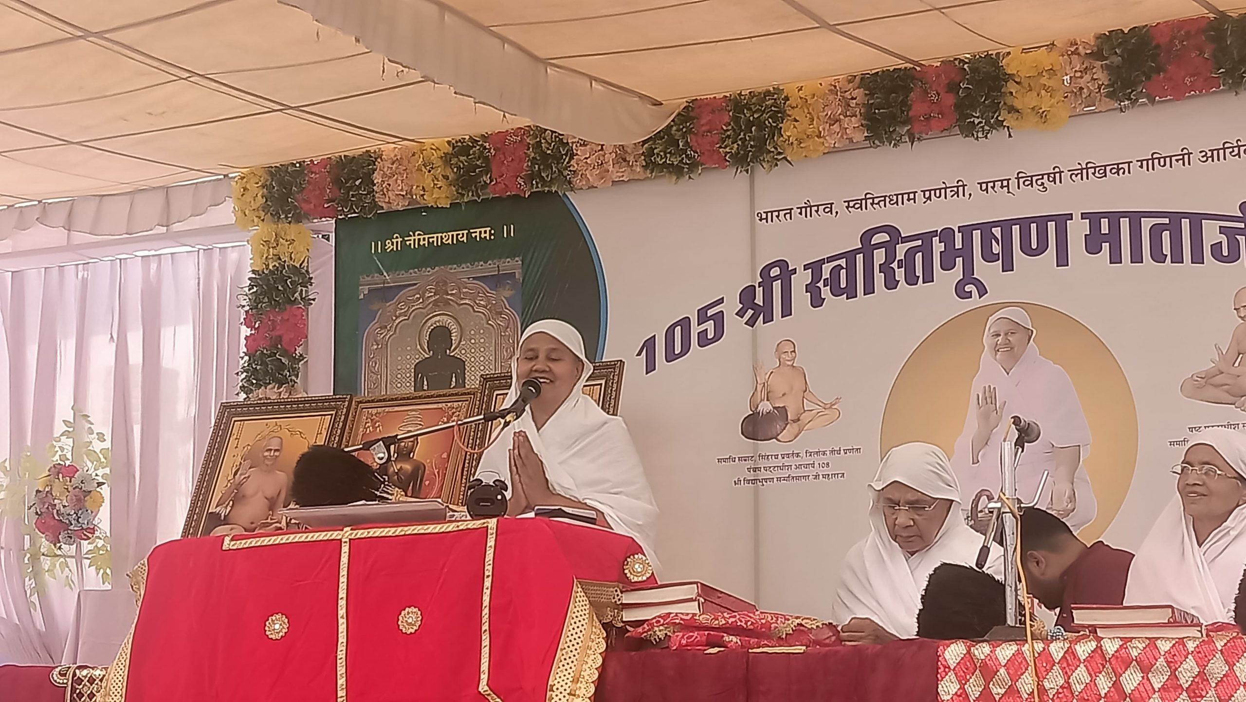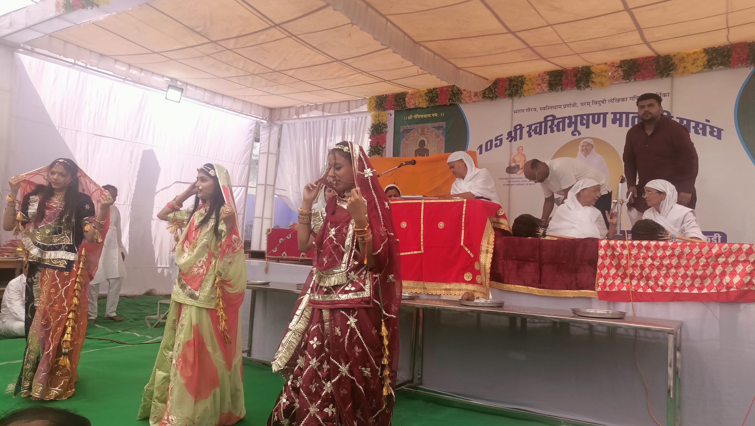 धर्मसभा में सर्वप्रथम भगवान महावीर ,आचार्य श्री ज्ञान सागर व आचार्य श्री विद्याभूषण सन्मति सागर महाराज के चित्र अनावरण व दीप प्रज्जवलन पदमचंद पाटनी देवली,विनोद जैन पारस चैनल कोटा, अनिल मित्तल, गोविंद जैन सदारा,बीजेपी नगर अध्यक्ष रितेश जैन व सभी जैन मंदिरों के अध्यक्ष गणों द्वारा किया गया । पाद प्रक्षालन भागचंद ज्ञानचंद सुनील कुमार जैन ज्वेलर्स ने किया । माताजी को शास्त्र भेंट करने का सौभाग्य पारसमल महावीर प्रसाद बघेरा,ओम प्रकाश गोविंद जैन सदारा, व कैलाश चंद पीयूष कुमार जैन मावा वालों को प्राप्त हुआ। धर्मसभा के प्रारंभ में राजुल महिला मंडल की अध्यक्ष चंद्रकला जैन ने मंगलाचरण प्रस्तुत किया। इसी के साथ अनुष्का, वारिधि व साक्षी ने ने सुन्दर भक्ति कर मंगलाचरण प्रस्तुत किया ।