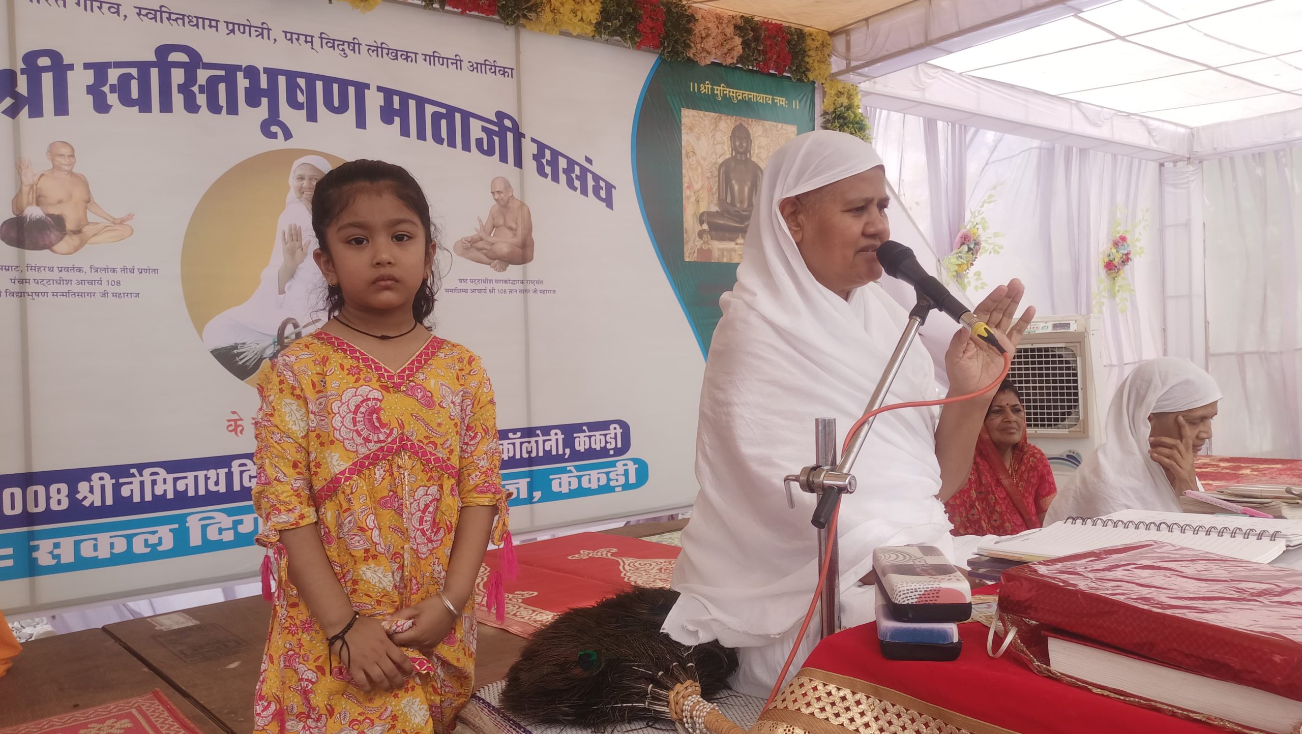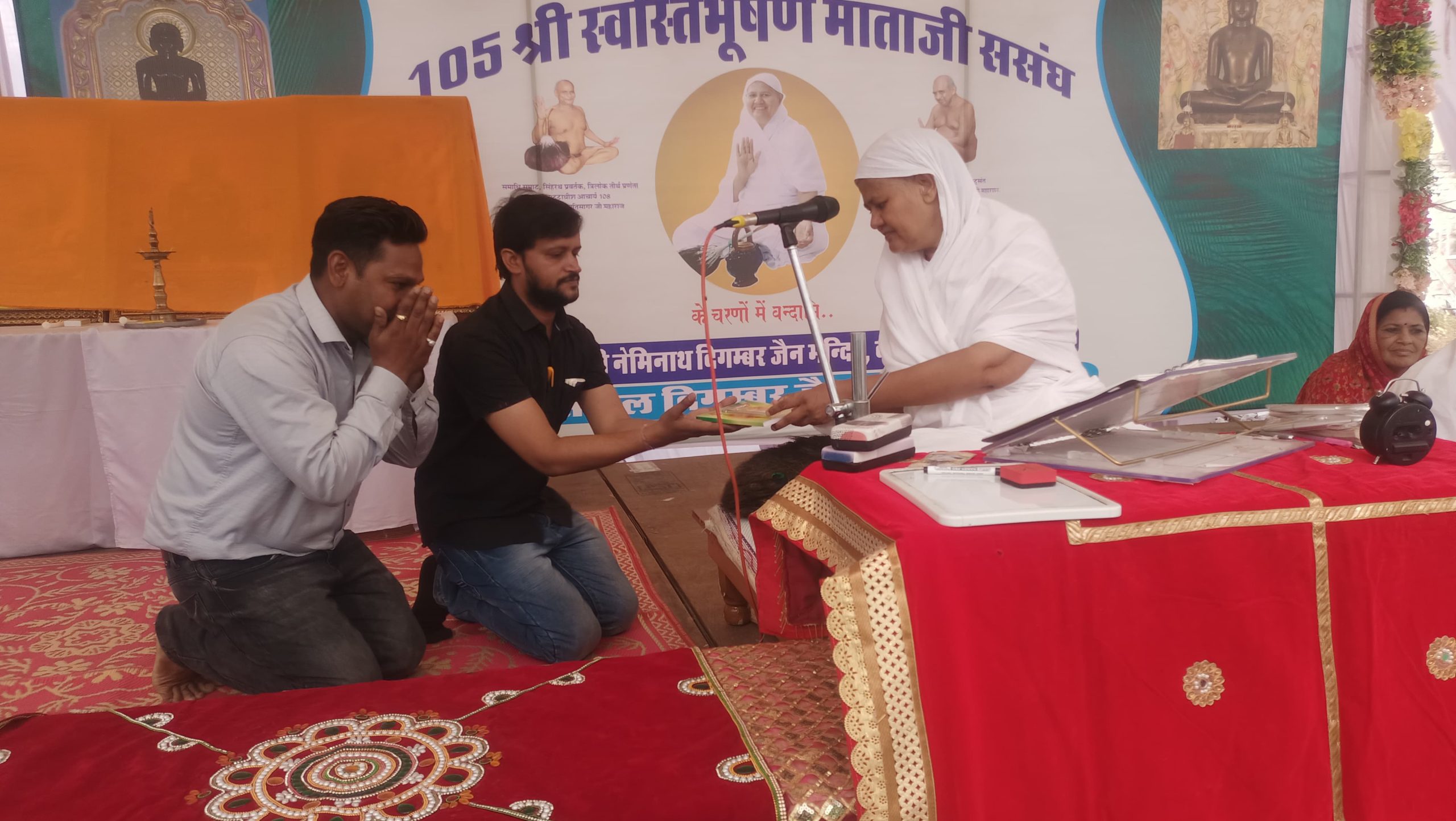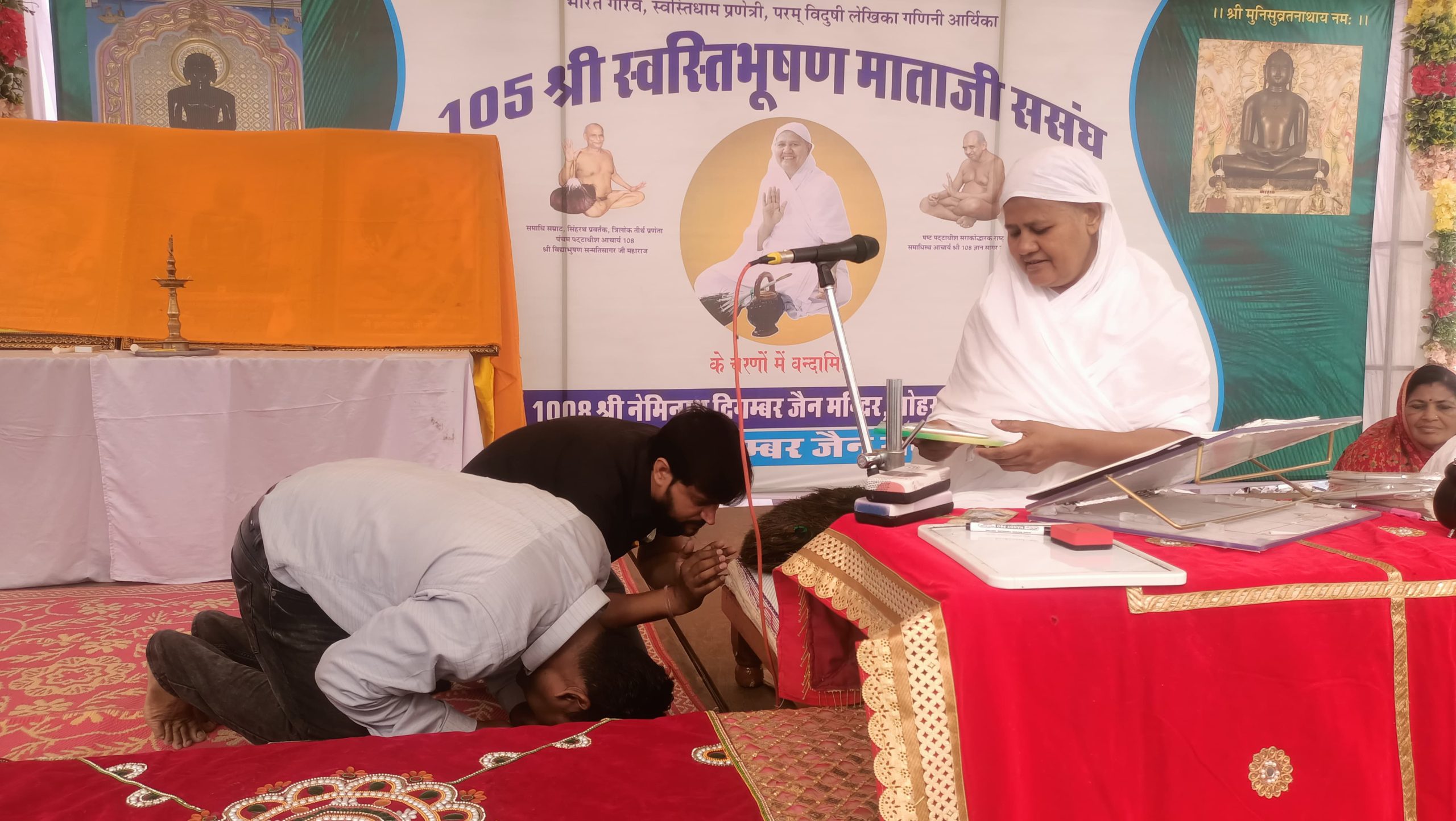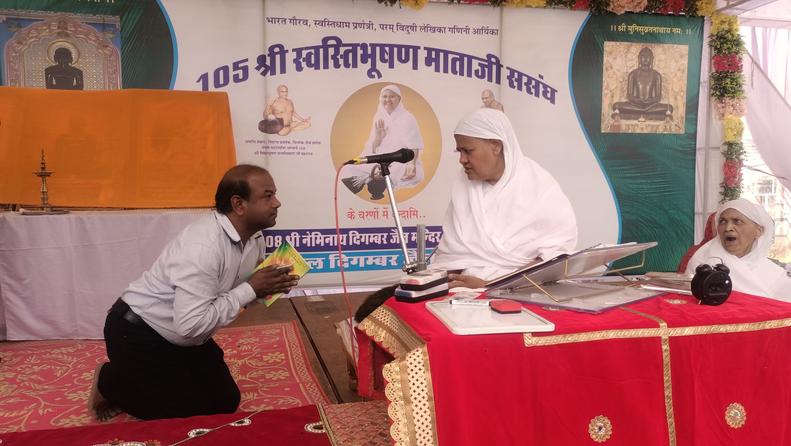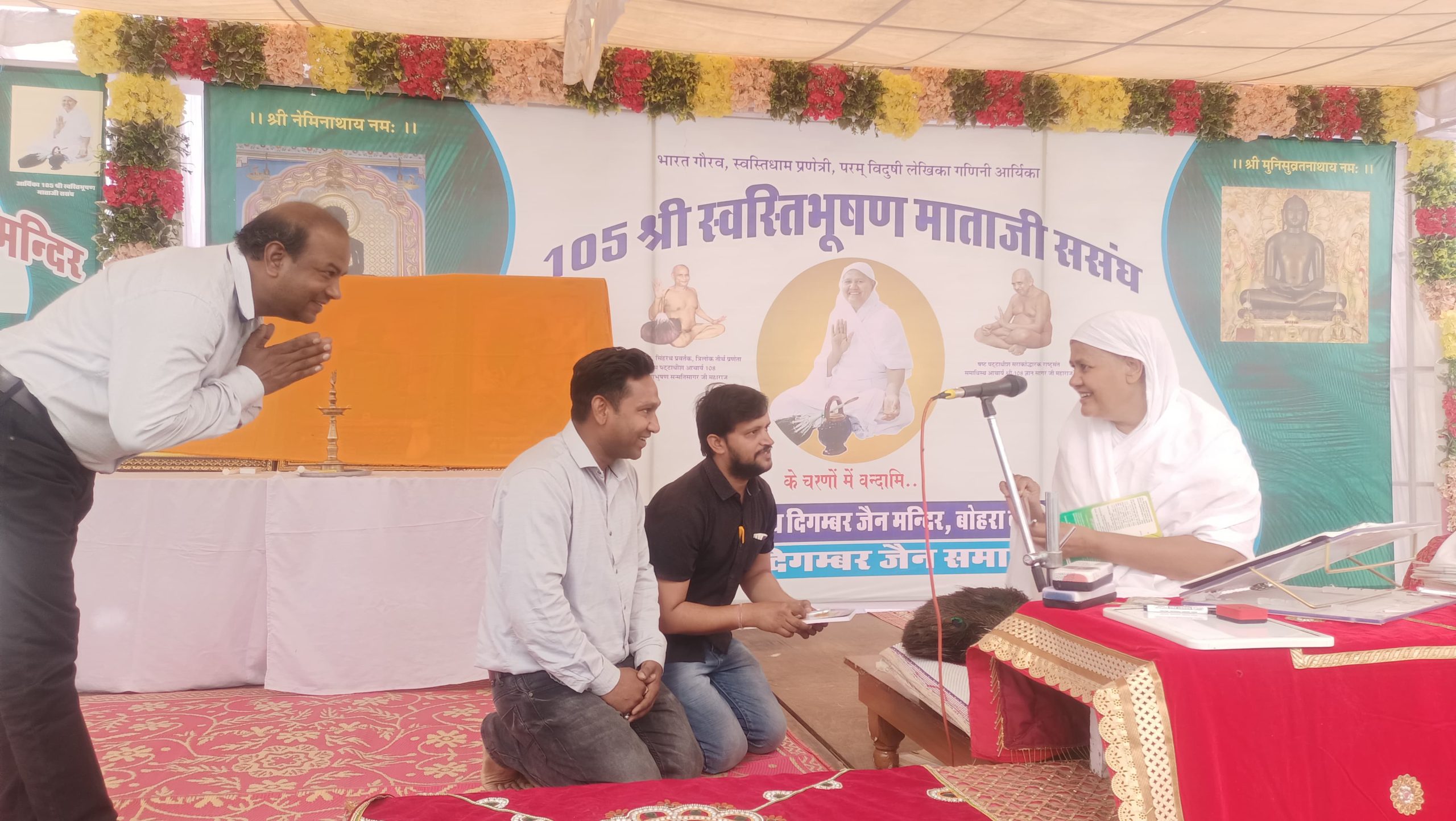समाज के वरिष्ठ जनों ने पत्रकारों का स्वागत अभिनंदन किया ।शास्त्र भेंट शुभकामना परिवार के अरिहंत ग्रुप ने किया ।आर्यिका माताजी के पाद प्रक्षालन टीकम चंद विपिन कुमार,जितेश,सानिध्य रामथला परिवार ने किया । इंदु मित्तल सुनीता पाटनी व विद्या जैन ने मंगलाचरण प्रस्तुत किया ।