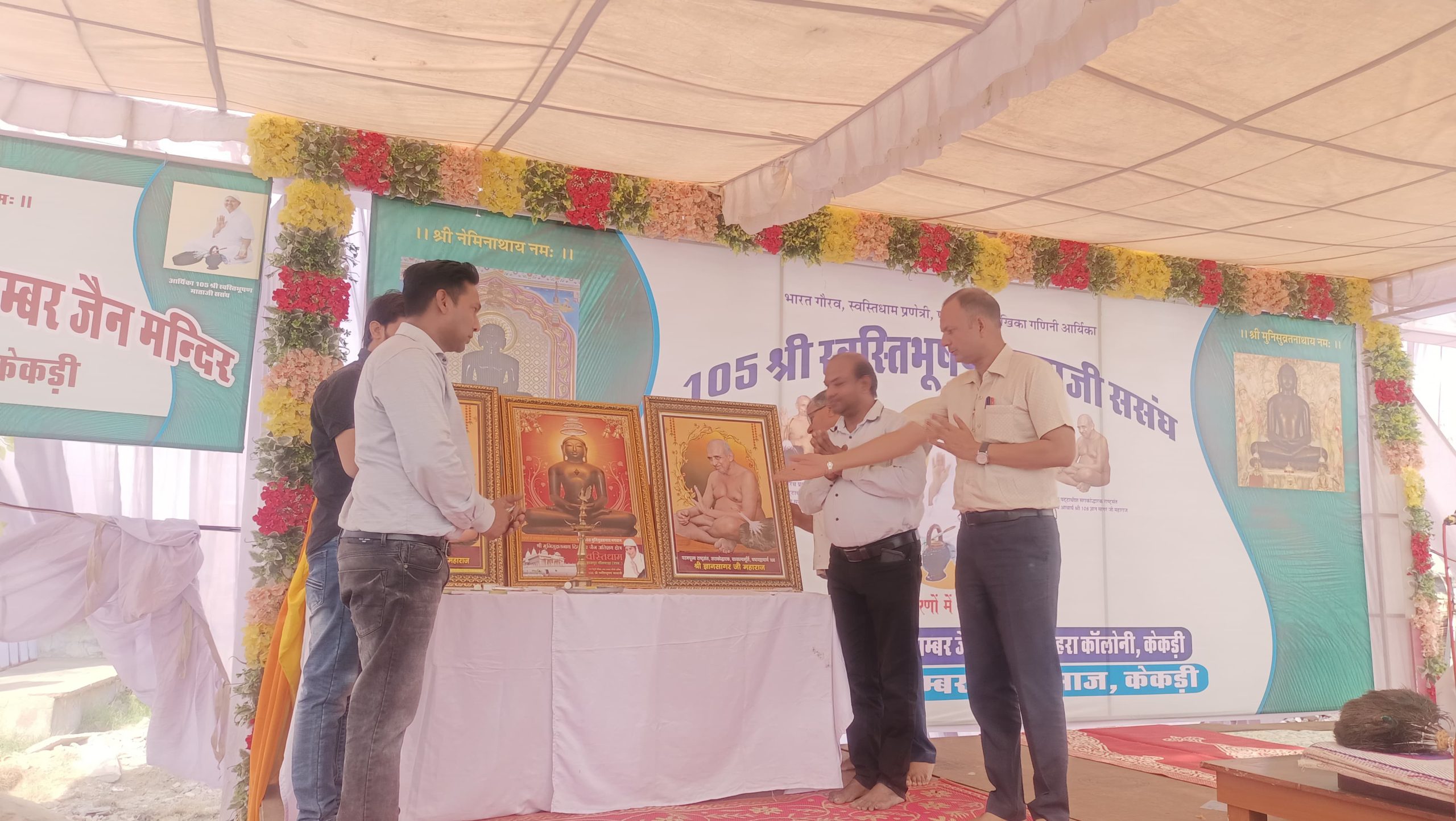 परंतु उसी मरते हुए कुत्ते को किसी समझदार व्यक्ति द्वारा णमोकार मंत्र सुनाने पर कुत्ता अच्छे भव में चले जाता है ।प्रातः जिनाभिषेक ,शांति धारा, जिनेन्द्रअर्चना,एवं धार्मिक क्रियाएं आर्यिका ससंघ के सानिध्य में सम्पन्न हुई ।शांति धारा करने का सौभाग्य दिनेश कुमार प्रकाश चंद नासिरदा व ओमप्रकाश गोविंद कुमार राजकुमार सदारा परिवार ने प्राप्त किया ।भगवान महावीर व आचार्यों के चित्र अनावरण व दीप प्रज्जवलन पत्रकार गणों द्वारा किया गया ।