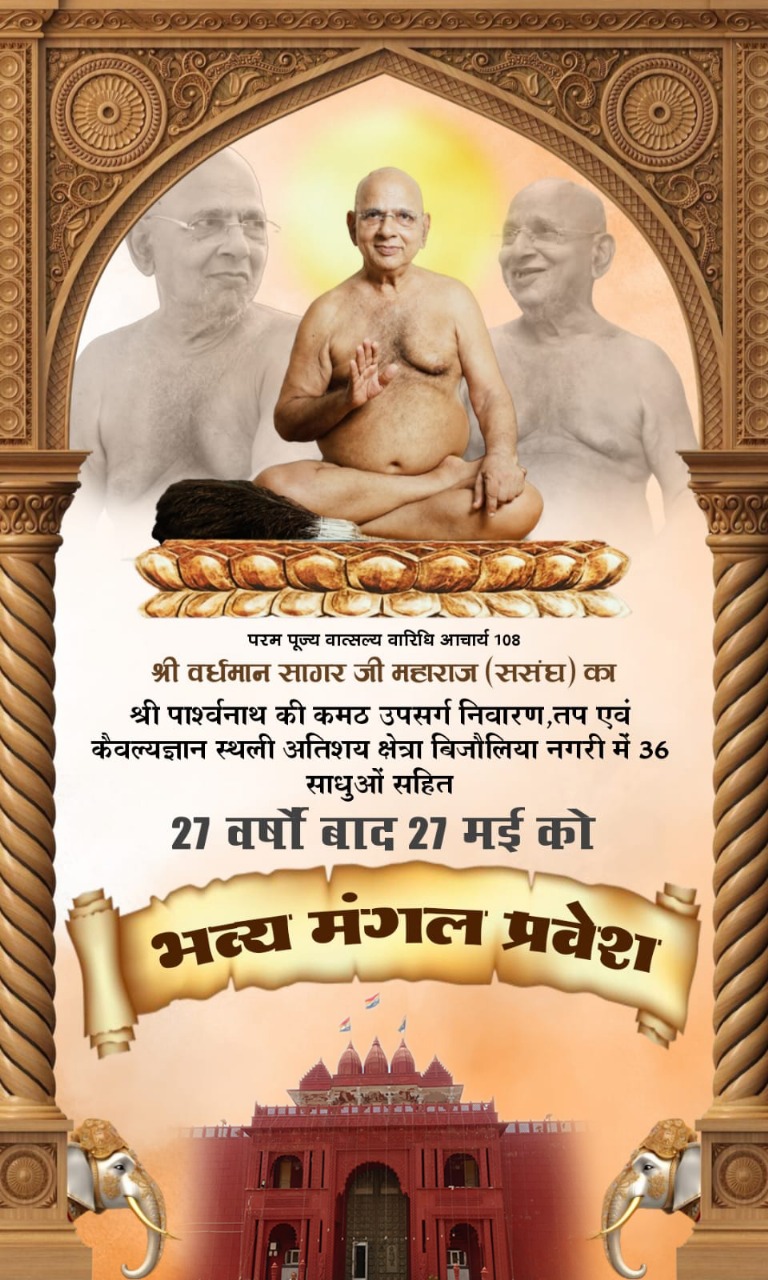 पार्श्वनाथ की कमठकृत उपसर्ग निवारण, तप एवं केवल्य ज्ञान स्थली अतिशय क्षेत्र बिजौलिया नगरी में पंचम पट्टाचार्य वात्सल्य वारिधि आचार्य 108 श्री वर्धमान सागर जी महाराज का 36 साधुओं सहित 27 वर्षों बाद 27 मई को 3.3 km विहार कर भव्य मंगल प्रवेश हुआ राजेश पंचोलिया से प्राप्त जानकारी अनुसार इसके पूर्व 2 फरवरी 1998 को आचार्य श्रीवर्धमान सागर जी का संघ सहित बिजोलिया में प्रवेश हुआ विंध्याचली पार्श्वनाथ तीर्थ क्षेत्र बिजोलिया भगवान श्री पारसनाथ की तपोभूमि धरणेंद्र पद्मावती द्वारा कमठ कृत उपसर्ग निवारण भूमि एवं केवल ज्ञान प्राप्ति स्थल है इधर उधर फैले बड़े-बड़े पत्थर कहानी कहते हैं