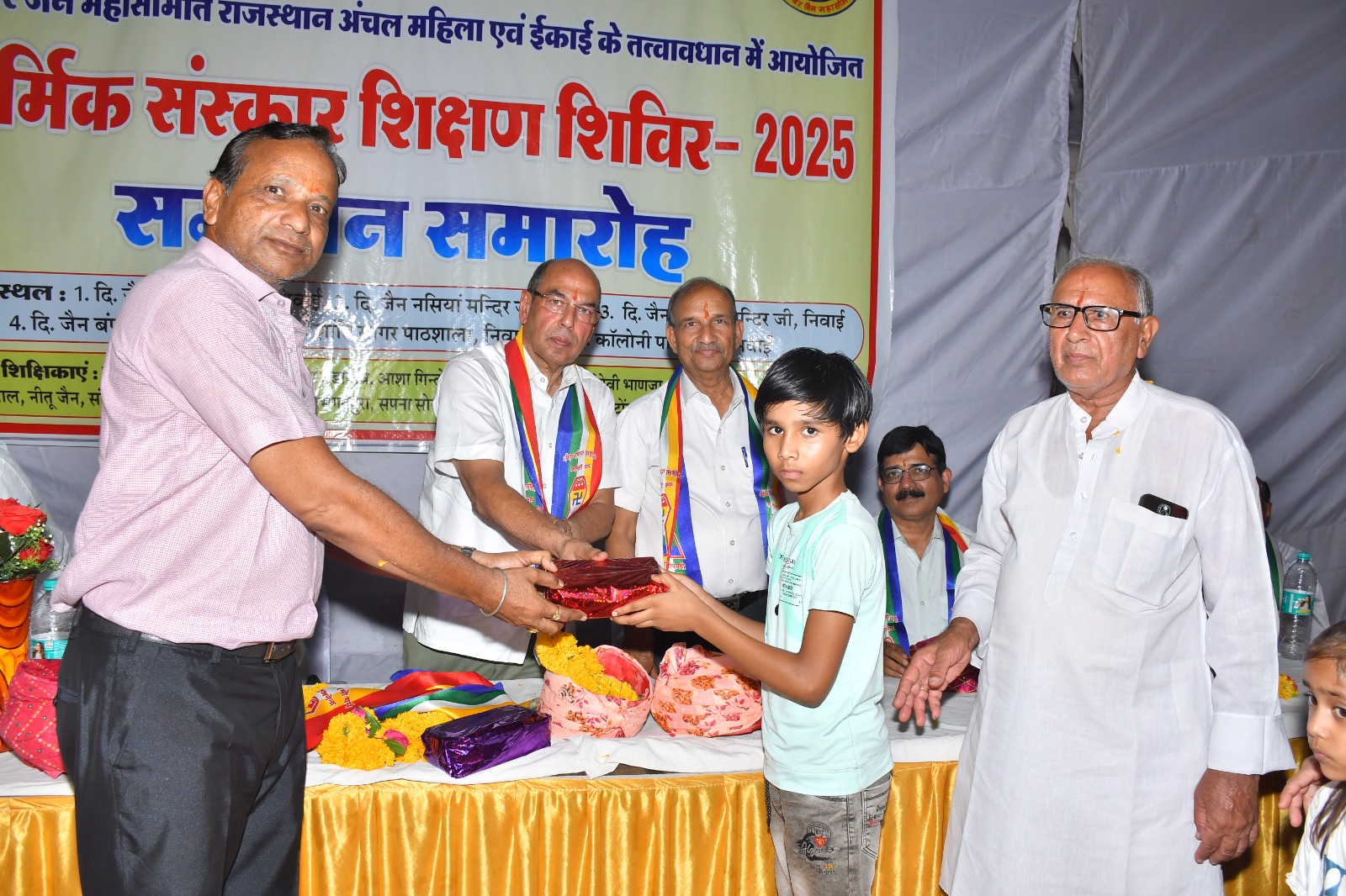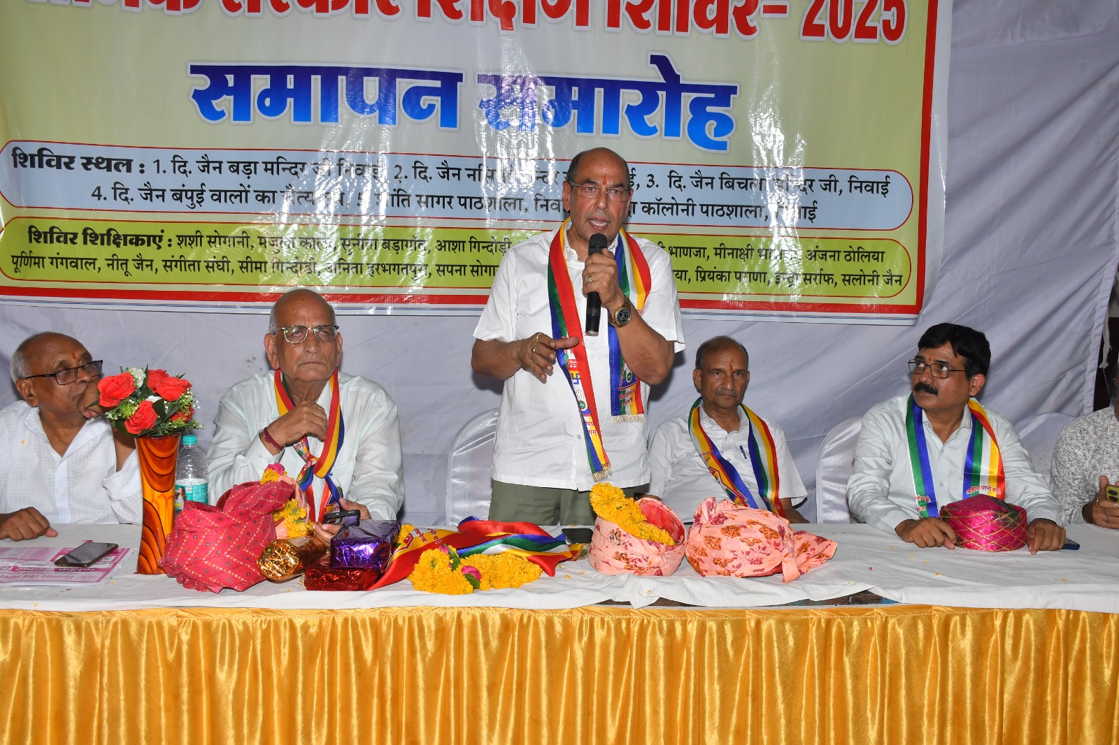समारोह का मंगलाचरण नन्ही बालिकाएं याना एवं आना ग्रुप ने सांस्कृतिक कार्यक्रम की प्रस्तुति दी। कार्यक्रम में भगवान चंद्र प्रभु के समक्ष दीप प्रज्वलन करने का सौभाग्य लालचंद शुभम कुमार कठमाणा ने किया एवं चित्र अनावरण करने का सौभाग्य दिगम्बर जैन महासमिति महिला अंचल सरंक्षिका मृदुला जैन एवं समाज गौरव सुरेन्द्र जैन पांडया एवं महिला अंचल अध्यक्ष शकुंतला बिन्दायका एवं सुनीता गंगवाल ने किया। दिगम्बर जैन महासमिति संभाग मंत्री विमल जौंला ने बताया कि शिविर के तहत बच्चों ने लिखित एवं मौखिक परीक्षा दी। शिविर में प्रथम भाग, द्वितीय भाग, तृतीय भाग एवं छहढा़ला सहित 5 विषयों के लगभग 200 बच्चों ने धार्मिक संस्कारों की शिक्षा ग्रहण की। प्रवक्ता राकेश संधी एवं त्रिलोक रजवास ने बताया कि शिविरार्थियों में नन्हे मुन्ने बालकों ने धार्मिक शिविर का लाभ अर्जित किया। शिविर के अन्तर्गत भाग लेने वाले बच्चों को विशेष पुरस्कार वितरण किया गया जिसमें प्रथम द्वितीय एवं तृतीय स्थान आने वालों को दिगम्बर जैन महासमिति संभाग निवाई एवं महिला ईकाई निवाई द्वारा पारितोषिक पुरस्कार दिया गया जिसमें लगभग 42 प्रधान पुरस्कार सहित 140 सांत्वना पुरस्कार दिया गया। समारोह का संचालन महावीर प्रसाद पराणा एवं विमल जौंला ने किया। इस अवसर पर समारोह के मुख्य अतिथि सुरेन्द्र जैन पांडया ने संबोधित करते हुए कहा कि शिविर में जिन्होंने दस दिन तक तन मन और धन से भरपूर परिश्रम करके शिक्षण और संस्कारों का बीजारोपण कराया वह साधुवाद के पात्र हैं। धार्मिक संस्कार शिविर के माध्यम से भारतीय संस्कृति एवं धार्मिक एवं आध्यात्मिक संरक्षण करने का प्रयास किया गया है। समापन समारोह में महिला अंचल अध्यक्ष शकुंतला बिन्दायका मंत्री सुनीता गंगवाल अध्यक्ष हुकमचंद जैन जिला प्रमुख सरोज बंसल संरक्षक महावीर प्रसाद पराणा नवीन लुहाड़िया आदि राज्य भर से आए अतिथियों एवं वक्ताओं ने शिविरार्थियों को सम्बोधित किया। सभी अतिथियों का आयोजन समिति की ओर से स्वागत किया। इस दौरान महावीर प्रसाद छाबड़ा पदमचंद टोंग्या त्रिलोक रजवास राकेश संधी पवन रेणु टोंग्या सुनील भाणजा पवन बोहरा नरेश हतौना ताराचंद जैन प्रेमचंद सोगानी संजय सोगानी हितेश छाबड़ा महेन्द्र लावा ज्ञानचंद सोगानी शंभु कठमाणा विमल सोगानी शशी सोगानी शकुंतला छाबड़ा सुनीता जैन हेमा बनेठा प्रमिला छाबड़ा ज्योति छाबड़ा मेना सोगानी उर्मिला सोगानी निक्की पराणा संगीता संधी विजया टोंग्या सावित्री जैन सहित अनेक गणमान्य महिलाएं एवं पुरुष मौजूद रहे।