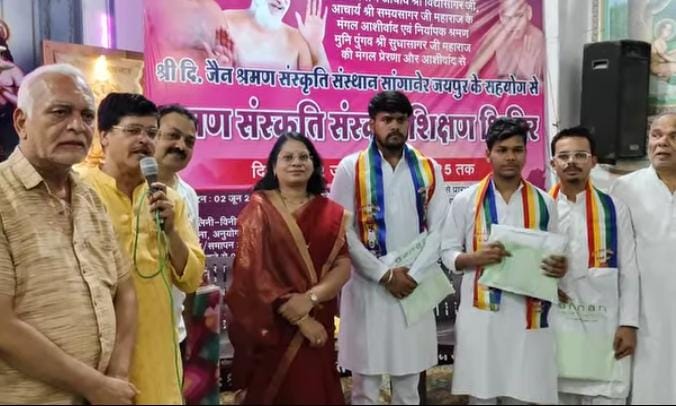 संस्कार एक ऐसी विद्या जो जीवन में कभी समाप्त नहीं होती-डा शालनी जैनश्रमण संस्कृति संस्कार शिविर के समापन पर टापर्स सहित अन्य को सम्मानित किया गया अशोकनगर —मुनि पुंगव श्रीसुधासागरजी महाराज के आशीर्वाद से श्रमण संस्कृति संस्थान सांगानेर जयपुर द्वारा श्री दिगम्बर जैन पंचायत कमेटी के तत्वावधान में आयोजित श्रमण संस्कृति संस्कार शिक्षण शिविर का समापन गंज मन्दिर में डा शालनी वनीत कुमार जैन एस पी अशोक नगर के मुख्य आतिथ्य में रखा गया जिसमें सभी मन्दिरों की पाठशालाओ मे अध्ययनरत शिविरार्थियों में श्रेष्ठ शिविरार्थियों को पुरूस्कार प्रदान किये गए शिविर में सर्व श्रेष्ठ स्थान नीलेश भइया ने प्राप्त किया इसके साथ ही सभी कक्षाओं के प्रथम द्वितीय तृतीय स्थान प्राप्त करने वाले शिविरार्थियों को पुरस्कृत अतिथियों द्वारा प्रदान किये गये।