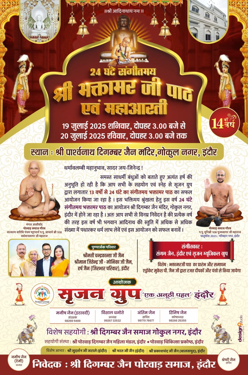 सन्मति जैन काका ने बताया की सृजन ग्रुप इंदौर के द्वारा पिछले 13 वर्षों निरन्तर इंदौर के अलग अलग जैन मंदिरों में भक्तामर जी का पाठ आयोजित किया जाता रहा है। पोरवाड़ समाज इंदौरअध्यक्ष नमीष जैन ने बताया की इसी क्रम में इस वर्ष ग्रुप के द्वारा श्री पार्श्वनाथ दिगंबर जैन मंदिर गोकुल नगर इंदौर में पोरवाड़ समाज गौरव वात्सल्य वारिधि आचार्यरत्न परम पूज्य 108 वर्धमान सागर जी महाराज के आशीर्वाद से एवं पोरवाड़ गौरव अंतर्मुखी मुनि 108 पूज्य सागर जी महाराज के सानिध्य में 19 जुलाई शनि वार से 20 जुलाई रविवार तक 24 घंटे का भक्तामर जी के पाठ एवं महा आरती का आयोजन किया जा रहा है। सृजन ग्रुप के अध्यक्ष विशाल धनोते ने निमाड़ मालवा सहित देश विदेश के सभी जैनोत्तर बंधुओं से साक्षात एवं झूम मीटिंग के द्वारा जुड़ने का आग्रह किया है।
