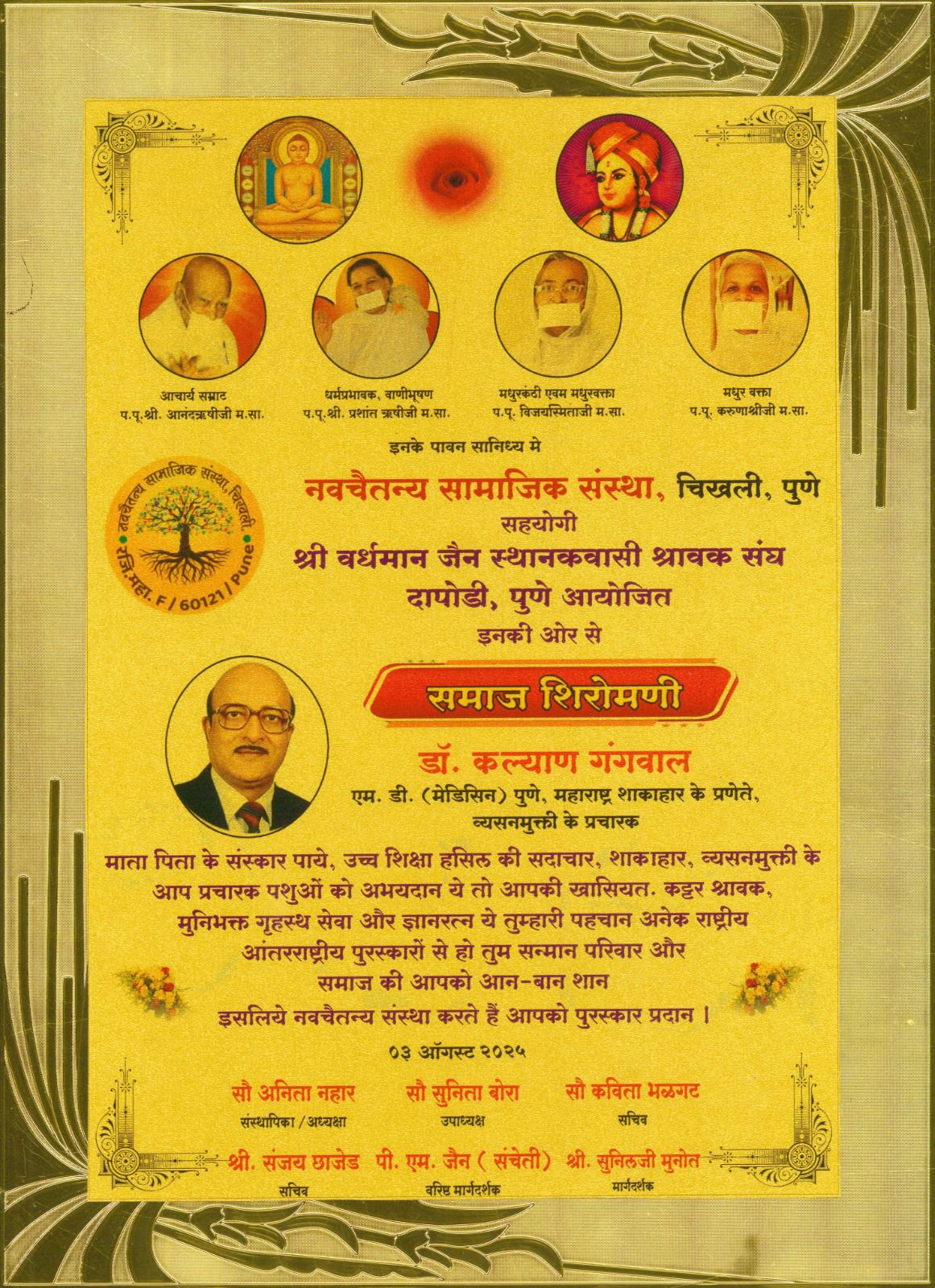 नव चैतन्य सामाजिक संस्था, चिखली और श्री वर्धमान जैन स्थानकवासी श्रावक संघ दापोडी की और से डॉक्टर गंगवाल की 50 वर्षों के निस्वार्थ कार्यों हेतु सम्मान किया गया।