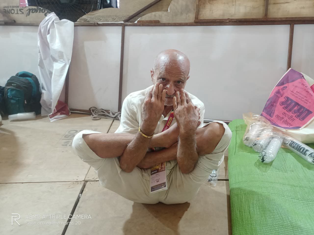 86 वर्ष के शिविरार्थी शशिकांत माणिकचंद्र शाह योग करते है और सप्ताह में 22 किलोमीटर पैदल चल रहे हैं शिविर में सबका ध्यान अपनी और खींच रहे हैं।