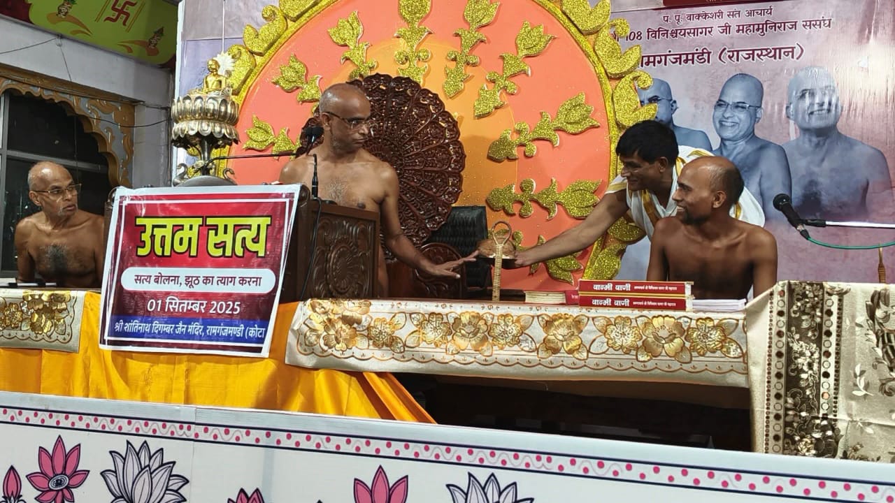 इस बेला में आचार्य श्री 108 विनिश्चय सागर महाराज ने उत्तम सत्य धर्म पर प्रकाश डाला आचार्य श्री ने सत्य के विषय में प्रकाश डालते हुए कहा कि सत्य का मतलब होता है ऐसी स्थिति में पहुंच जाना जो आत्मा के अलावा कहीं ना हो। वचनों में ही सत्य होना चाहिए वचनों से तो व्यक्त होता है लेकिन सत्य तो आत्मा में होता है। क्रिया में सत्य दिखाई देता है लेकिन वह सत्य आत्मा में होता है। सत्य धर्म आत्मा का धर्म है।