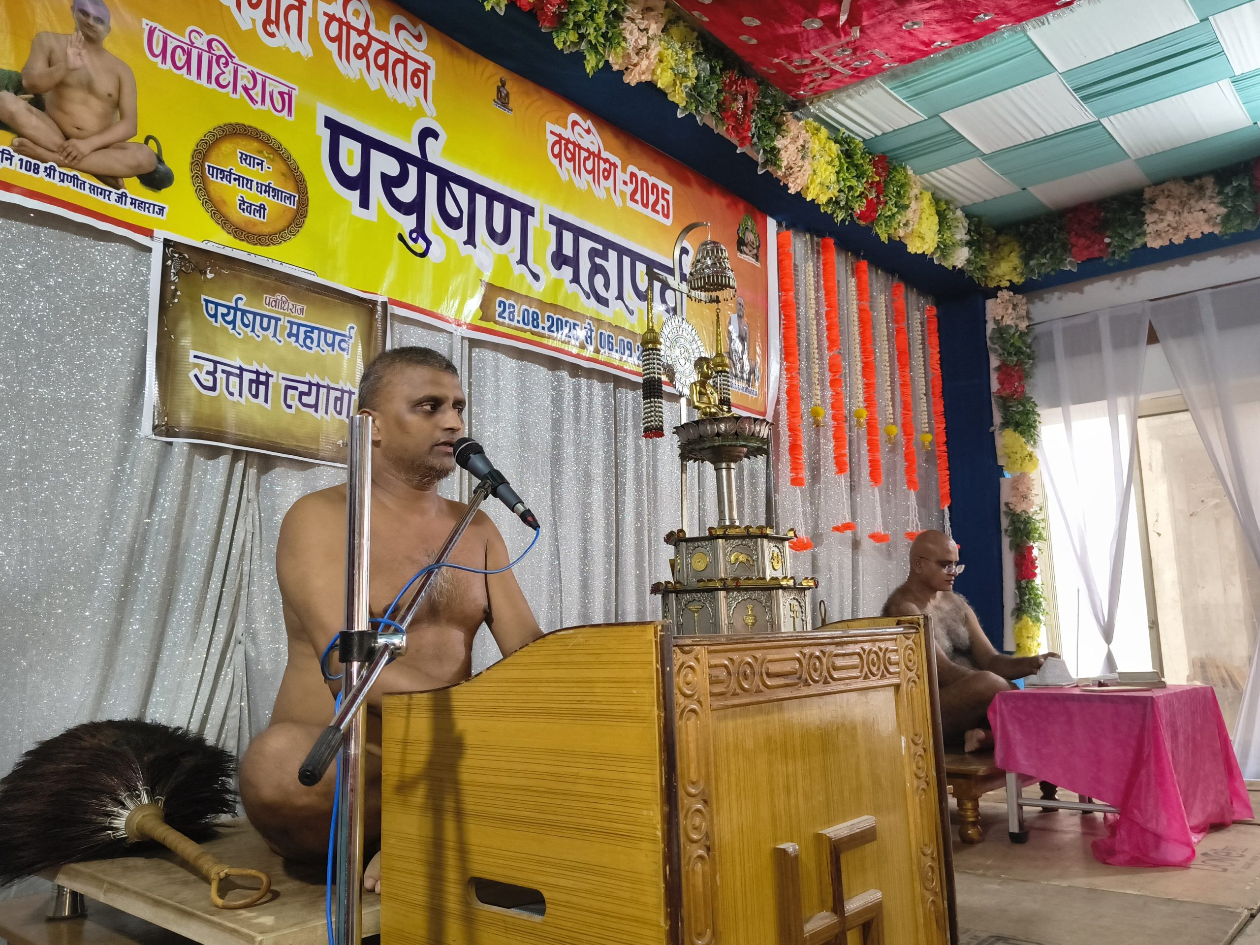 देवली,धर्मनगरी देवली मे विवेकानंद कॉलोनी स्थित पार्श्वनाथ धर्मशाला में परम पूज्य मुनि श्री 108 प्रणीत सागर जी महाराज एवं क्षुल्लक 105 श्री विधेय सागर जी महाराज के सान्निध्य में चल रहे पर्युषण पर्व महामहोत्सव के अंतर्गत अष्टम दिवस पर “उत्तम त्याग धर्म” पर सम्बोधन देते हुए बताया की त्याग किया गणतं का पर क्या किया मनगढ़ंत का!मुनि श्री ने सूत्र के माध्यम से बताया “शरीर मे लग जाये आग, उससे पहले कर लो त्याग”