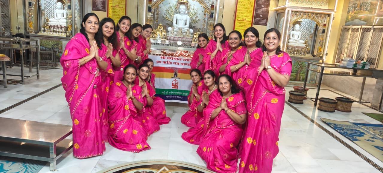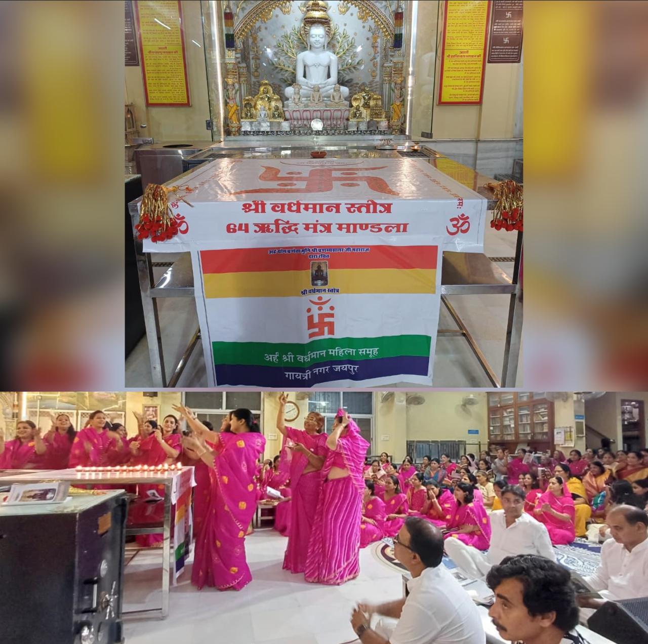 दिगम्बर जैन मंदिर गायत्री नगर महारानी फार्म जयपुर में परम पूज्य मुनि श्री पावन सागर जी महाराज मुनि श्री सुभद्र सागर जी महाराज ससंघ के आशीर्वाद व सानिध्य में अर्हं श्री वर्धमान महिला समूह द्वारा 7 सितंबर रात्रि 8 बजे से अर्हम योग प्रणेता परम पूज्य मुनि श्री प्रणम्य सागर जी महाराज द्वारा रचित श्री वर्धमान स्तोत्र ऋद्धि मंत्रों के साथ भक्ति पूर्वक सम्पन्न हुआ।