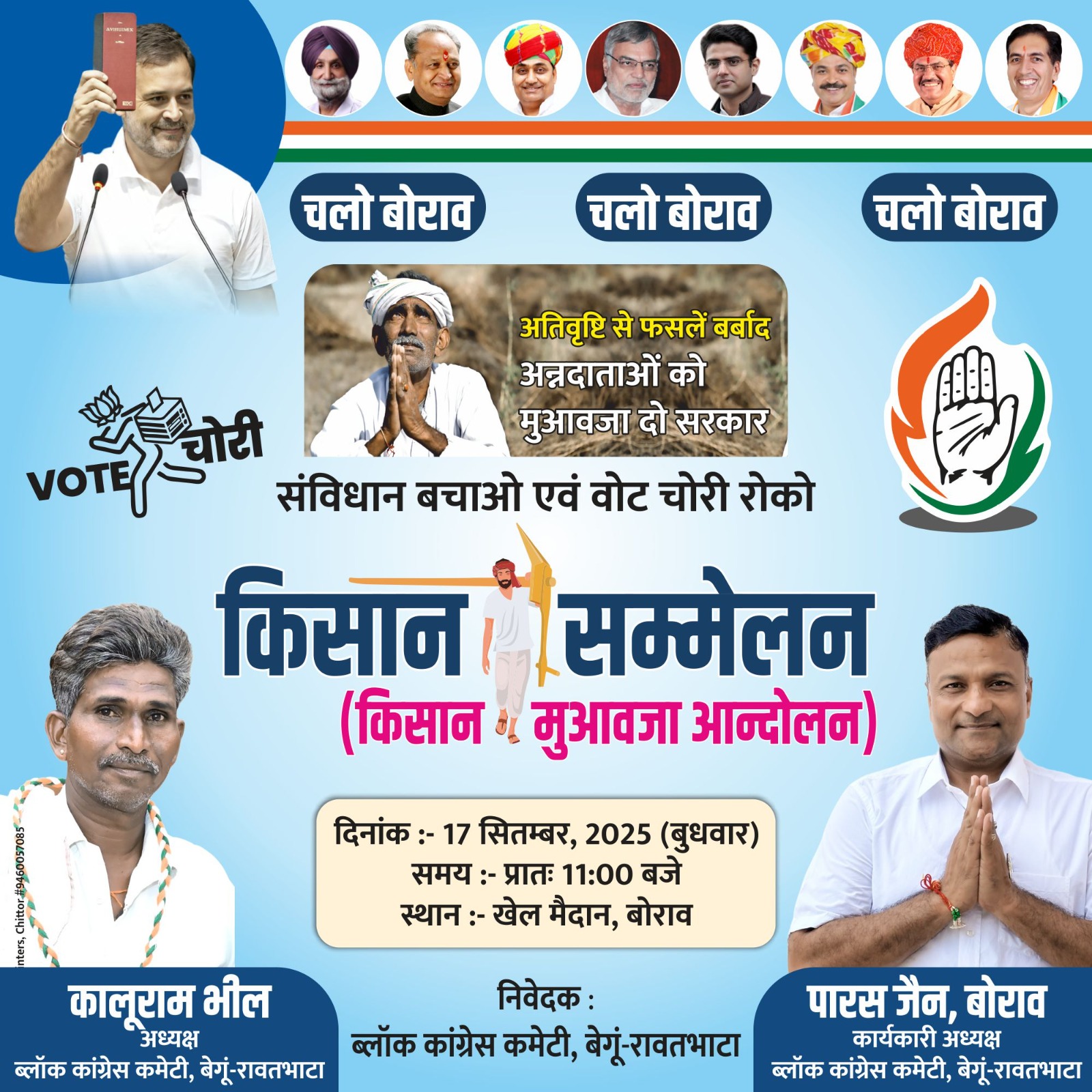 विगत दिनों किसान सम्मेलन का पोस्टर विमोचन, संविधान बचाओ और वोट चोरी रोको का संदेश पोस्टर का विमोचन बेगू रावतभाटा के कांग्रेस कार्यकारी ब्लॉक अध्यक्ष पारस जैन के नेतृत्व में विमोचन किया गया। यह सम्मेलन 17 सितंबर को प्रातः 11:00 बजे खेल मैदान बोराव राजस्थान में संपन्न होगा।