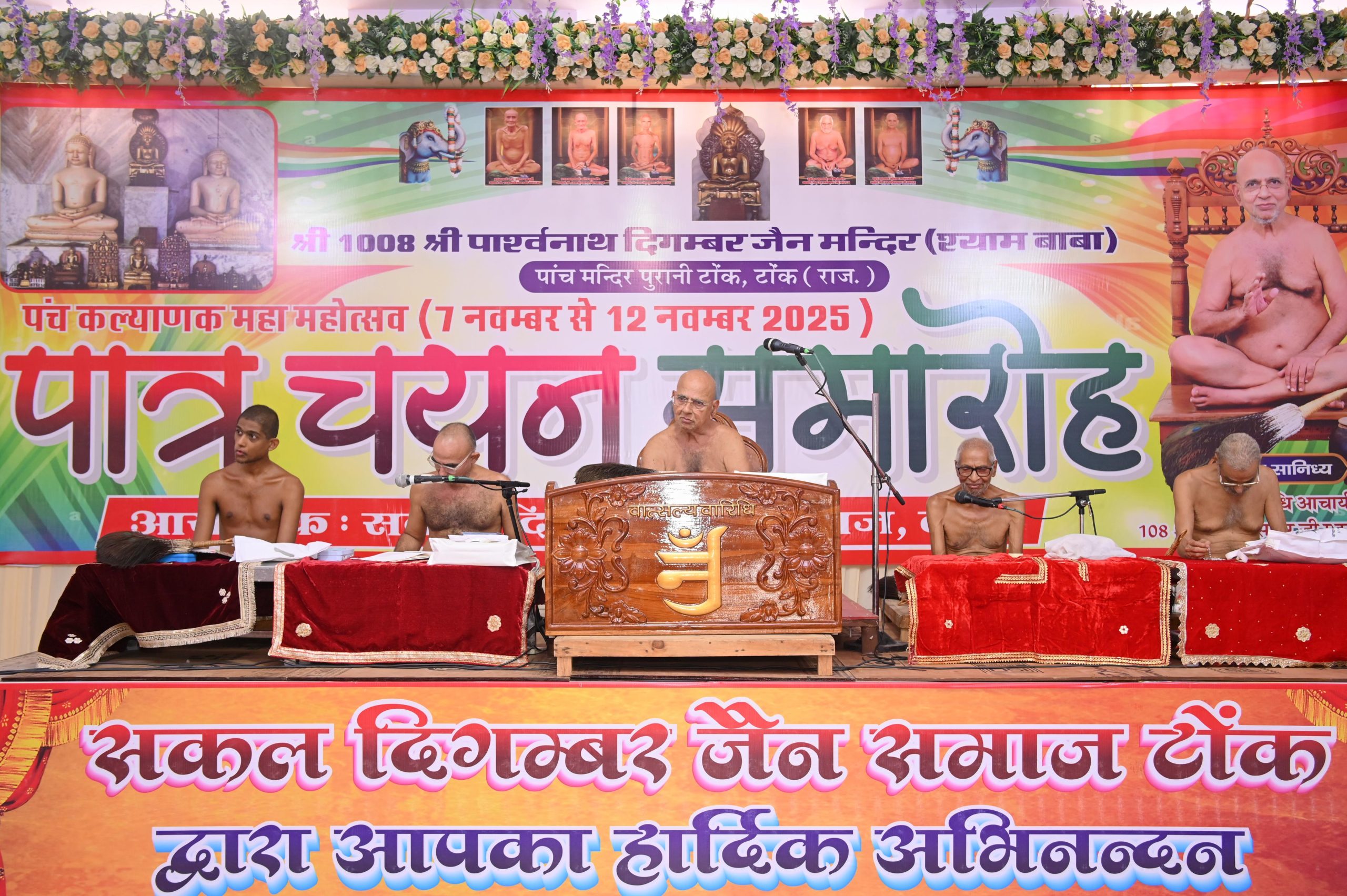 टोंक आचार्य श्री वर्धमानसागर जी सहित विशाल संघ सानिध्य में आगामी 7 नवंबर से 12 नवंबर तक श्री चंद्र प्रभु जिनालय नसिया में पंचकल्याणक प्रतिष्ठा हेतु प्रमुख पात्रों का चयन बोली के माध्यम से आचार्य श्री संघ सानिध्य में हुआ।जिसमें सौधर्म,भगवान के मातापिता,कुबेर, सनत, मुख्य यज्ञनायक, आदि इंद्र परिवार का चयन हुआ। इस अवसर पर आचार्य श्री वर्धमान सागर जी ने पुरानी स्मृतियों को ताजा करते हुए बताया कि हम दीक्षा गुरु आचार्य श्री धर्म सागर जी के साथ सन 1970 में टोंक आए थे, पांच जिनालय के मंदिर में संघ रुका था।यह प्राचीन और महत्वपूर्ण जिनालय हैं जिनालय मंदिर जीवन के निर्माण में उपयोगी सहयोगी माध्यम है ।जिनवाणी के माध्यम से णमोकार महामंत्र प्राप्त हुआ जिनालय में अरिहंत भगवान विराजित होते हैं वह परम उपकारी है वह दिव्य ध्वनि से धर्म का मार्ग दिखाते हैं उससे जीवन में सफलता और मिलती है।