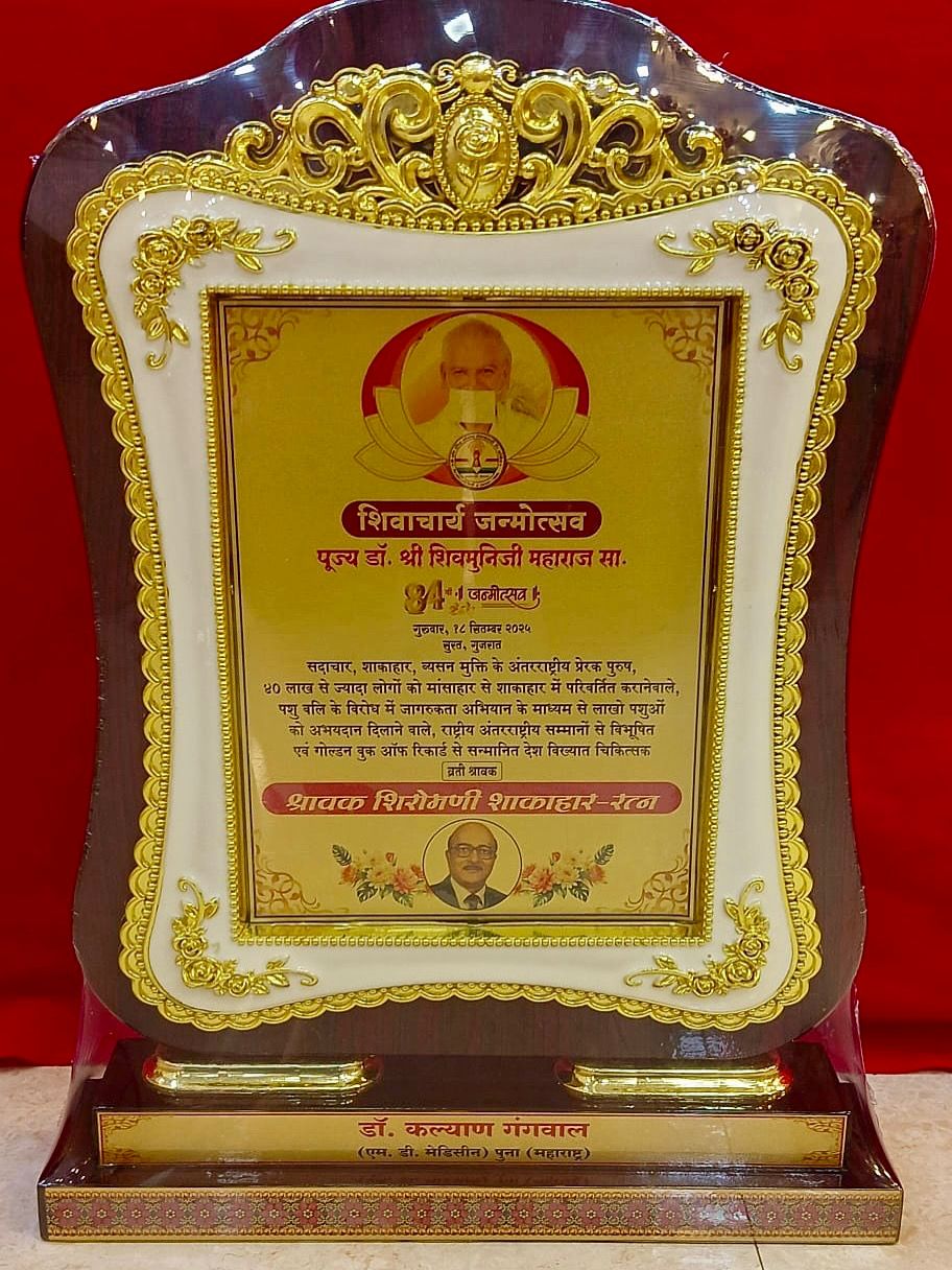 इस विशाल पावन समारोह मे दिगंबर जैन समाज के सुश्रावक शाकाहार. जीव दया.अहिंसा के प्रणेता पुनाके डॉ कल्याण गंगवाल को “श्रावक शिरोमणि : शाकाहार रत्न “ पुरस्कार से सम्मानित किया गया ! यह सम्मान आचार्य डॉ शिव मुनिश्री के पावन करकमलों द्वारा प्रदान किया गया !! उन्हें यह पुरस्कार उनके द्वारा सरकार के प्रचार प्रसार में कार्य करने एवं जीव दया परोपकार के क्षेत्र में अग्रणीय भूमिका निभाने हेतु प्रदान किया गया।
